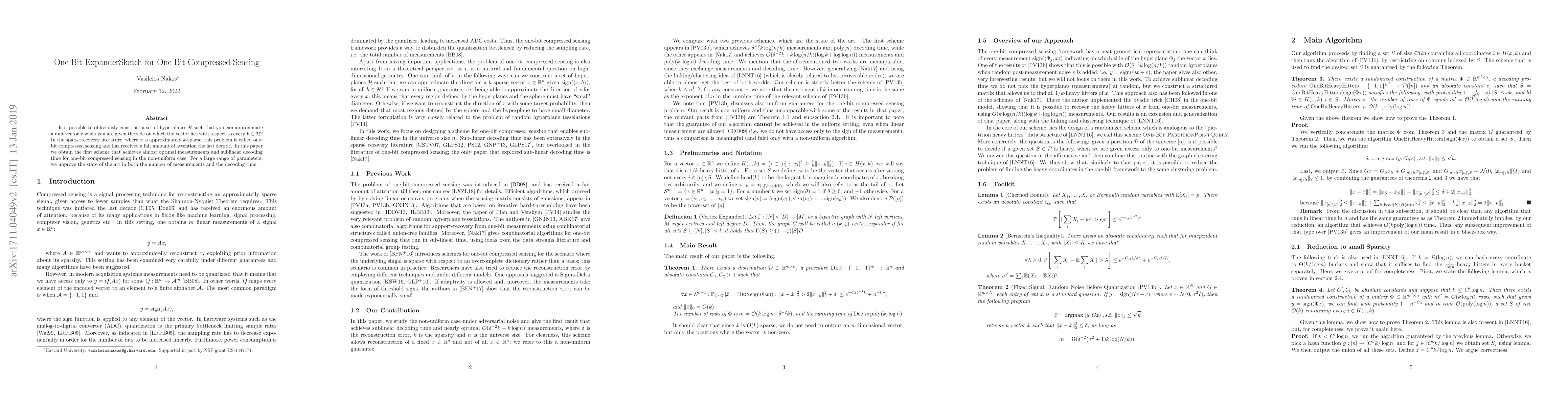 The paper presents an algorithm for one-bit compressed sensing (1BCS) using One-Bit ExpanderSketch, which achieves near-optimal measurements and sublinear decoding time in the non-uniform case for a wide range of parameters.