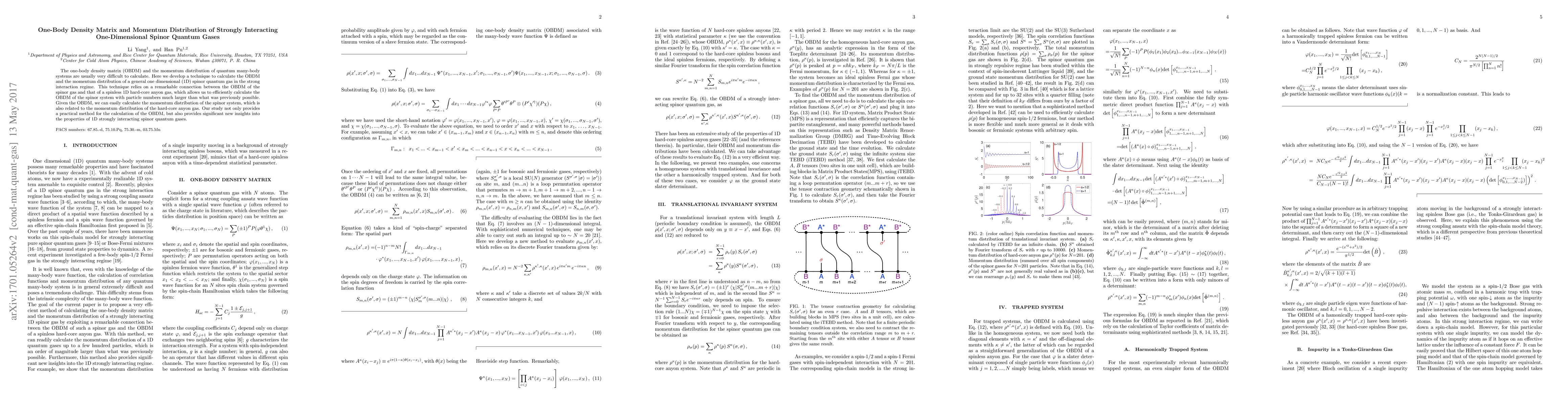 The one-body density matrix (OBDM) of a strongly interacting spinor quantum gas in one dimension can be written as a summation of products of spatial and spin parts. We find that there is a remarkable connection between the spatial part and the OBDM of a spinless hard-core anyon gas. This connection allows us to efficiently calculate the OBDM of the spinor system with particle numbers much larger than what was previously possible. Given the OBDM, we can easily calculate the momentum distribution of the spinor system, which again is related to the momentum distribution of the hard-core ayone gas.