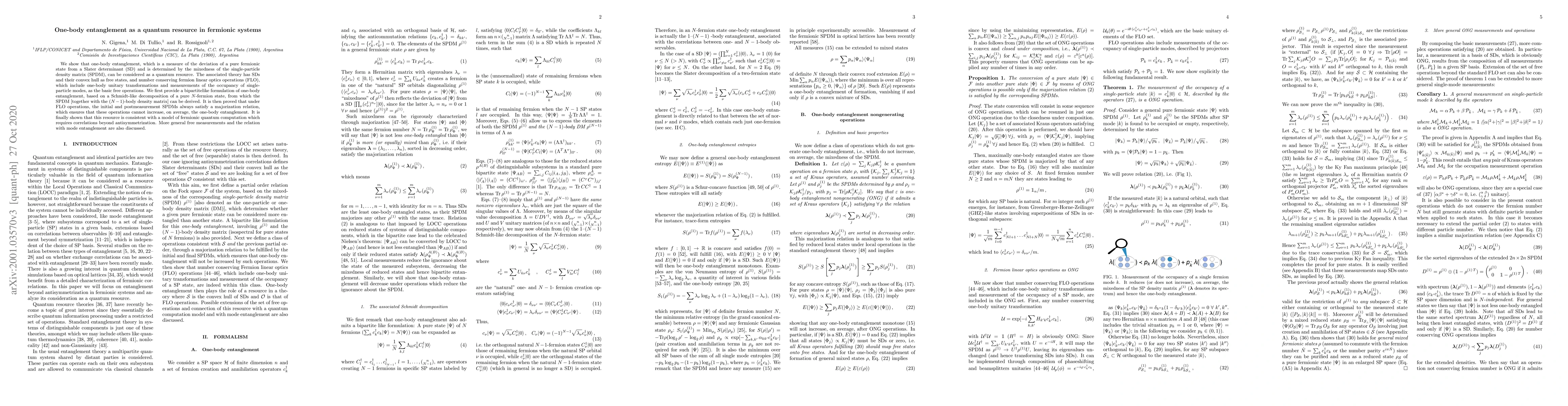 We show that one-body entanglement, which is a measure of the deviation of a pure fermionic state from a Slater determinant (SD) and is determined by the mixedness of the single-particle density matrix (SPDM), can be considered as a quantum resource. The associated theory has SDs and their convex hull as free states, and number conserving fermion linear optics operations (FLO), which include one-body unitary transformations and measurements of the occupancy of single-particle modes, as the basic free operations. We first provide a bipartitelike formulation of one-body entanglement, based on a Schmidt-like decomposition of a pure $N$-fermion state, from which the SPDM [together with the $(N-1)$-body density matrix] can be derived. It is then proved that under FLO operations, the initial and postmeasurement SPDMs always satisfy a majorization relation, which ensures that these operations cannot increase, on average, the one-body entanglement. It is finally shown that this resource is consistent with a model of fermionic quantum computation which requires correlations beyond antisymmetrization. More general free measurements and the relation with mode entanglement are also discussed.