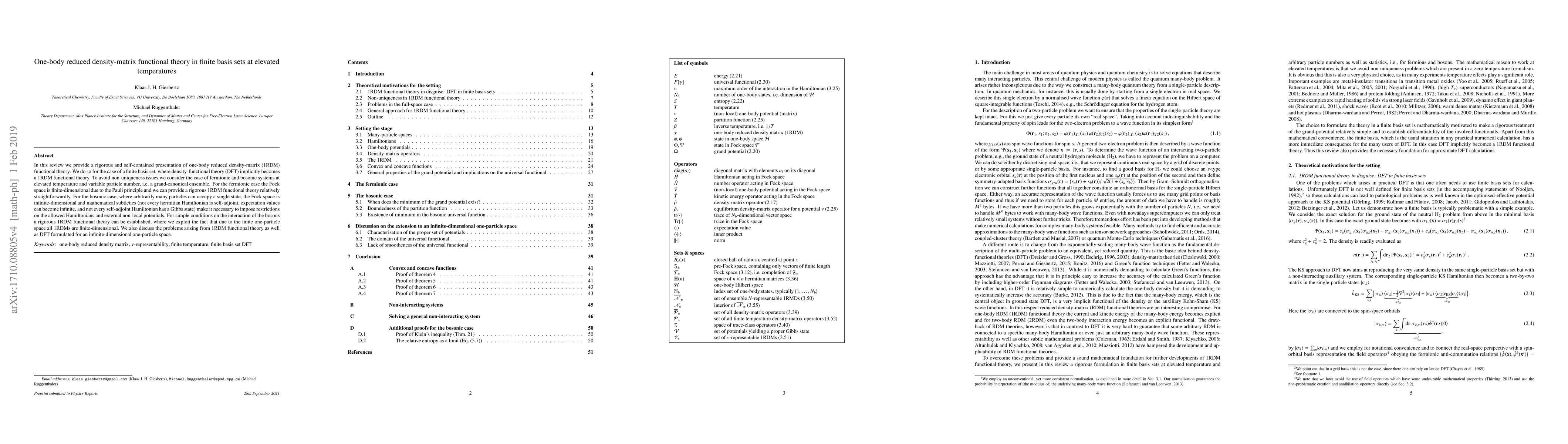 In this review we provide a rigorous and self-contained presentation of one-body reduced density-matrix (1RDM) functional theory. We do so for the case of a finite basis set, where density-functional theory (DFT) implicitly becomes a 1RDM functional theory. To avoid non-uniqueness issues we consider the case of fermionic and bosonic systems at elevated temperature and variable particle number, i.e, a grand-canonical ensemble. For the fermionic case the Fock space is finite-dimensional due to the Pauli principle and we can provide a rigorous 1RDM functional theory relatively straightforwardly. For the bosonic case, where arbitrarily many particles can occupy a single state, the Fock space is infinite-dimensional and mathematical subtleties (not every hermitian Hamiltonian is self-adjoint, expectation values can become infinite, and not every self-adjoint Hamiltonian has a Gibbs state) make it necessary to impose restrictions on the allowed Hamiltonians and external non-local potentials. For simple conditions on the interaction of the bosons a rigorous 1RDM functional theory can be established, where we exploit the fact that due to the finite one-particle space all 1RDMs are finite-dimensional. We also discuss the problems arising from 1RDM functional theory as well as DFT formulated for an infinite-dimensional one-particle space.