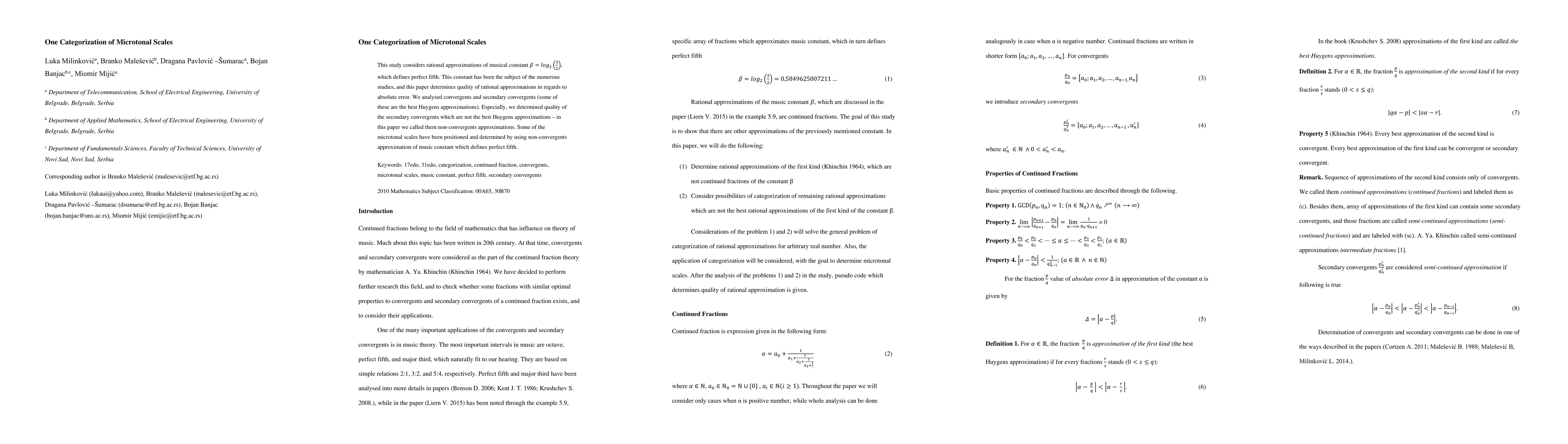 This study considers rational approximations of musical constant $\beta=\log_2(3/2)$, which defines perfect fifth. This constant has been the subject of the numerous studies, and this paper determines quality of rational approximations in regards to absolute error. We analysed convergents and secondary convergents (some of these are the best Huygens approximations). Especially, we determined quality of the secondary convergents which are not the best Huygens approximations - in this paper we called them non-convergents approximations. Some of the microtonal scales have been positioned and determined by using non-convergents approximation of music constant which defines perfect fifth.