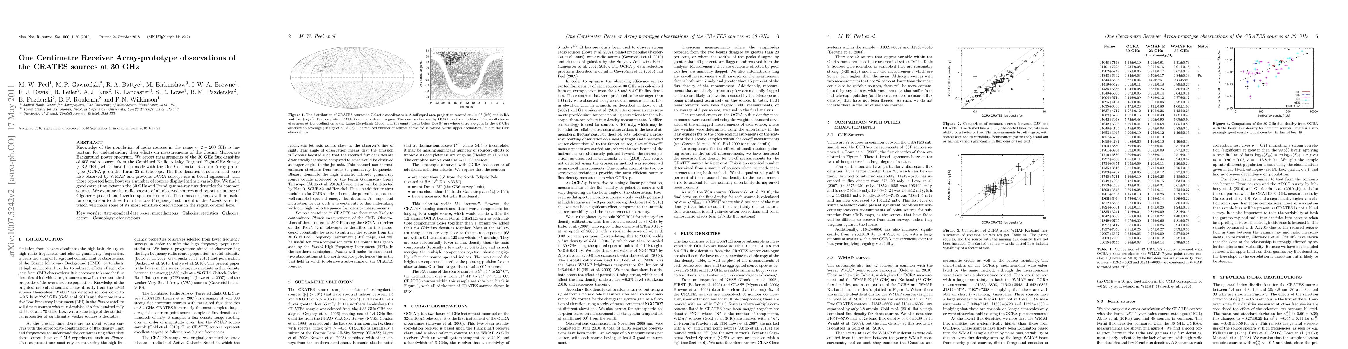 Knowledge of the population of radio sources in the range ~2-200 GHz is important for understanding their effects on measurements of the Cosmic Microwave Background power spectrum. We report measurements of the 30 GHz flux densities of 605 radio sources from the Combined Radio All-sky Targeted Eight-GHz Survey (CRATES), which have been made with the One Centimetre Receiver Array prototype (OCRA-p) on the Torun 32-m telescope. The flux densities of sources that were also observed by WMAP and previous OCRA surveys are in broad agreement with those reported here, however a number of sources display intrinsic variability. We find a good correlation between the 30 GHz and Fermi gamma-ray flux densities for common sources. We examine the radio spectra of all observed sources and report a number of Gigahertz-peaked and inverted spectrum sources. These measurements will be useful for comparison to those from the Low Frequency Instrument of the Planck satellite, which will make some of its most sensitive observations in the region covered here.