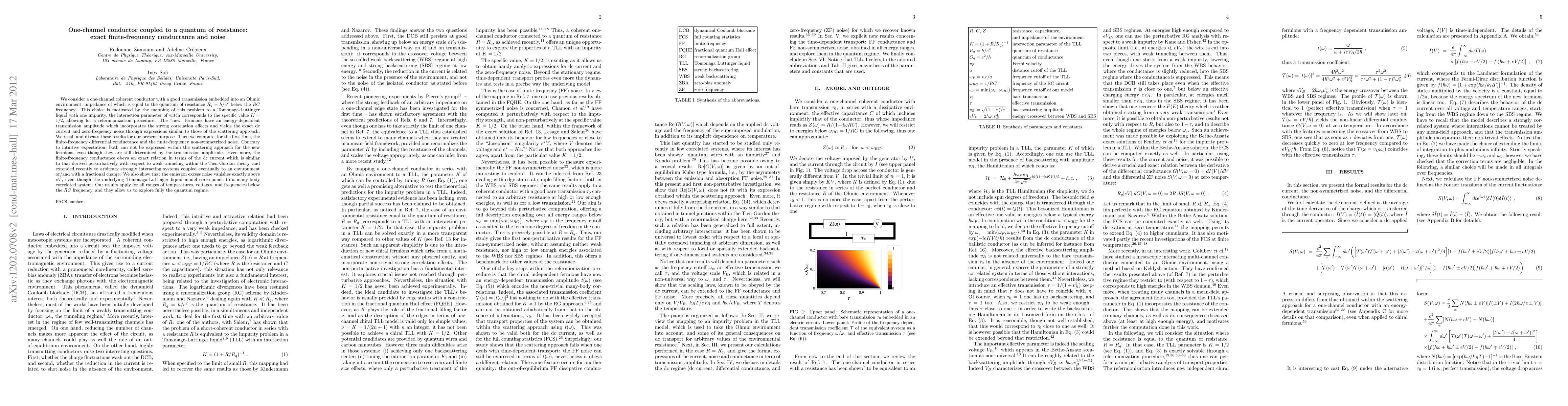 We consider a one-channel coherent conductor with a good transmission embedded into an ohmic environment whose impedance is equal to the quantum of resistance R_q=h/e^2 below the RC frequency. This choice is motivated by the mapping of this problem to a Tomonaga-Luttinger liquid with one impurity whose interaction parameter corresponds to the specific value K=1/2, allowing for a refermionization procedure. The "new" fermions have an energy-dependent transmission amplitude which incorporates the strong correlation effects and yields the exact dc current and zero-frequency noise through expressions similar to those of the scattering approach. We recall and discuss these results for our present purpose. Then we compute, for the first time, the finite-frequency differential conductance and the finite-frequency non-symmetrized noise. Contrary to intuitive expectation, both cannot be expressed within the scattering approach for the new fermions, even though they are still determined by the transmission amplitude. Even more, the finite-frequency conductance obeys an exact relation in terms of the dc current which is similar to that derived perturbatively with respect to weak tunneling within the Tien-Gordon theory, and extended recently to arbitrary strongly interacting systems coupled eventually to an environment or/and with a fractional charge. We also show that the emission excess noise vanishes exactly above eV, even though the underlying Tomonaga-Luttinger liquid model corresponds to a many-body correlated system. Our results apply for all ranges of temperature, voltages and frequencies below the RC frequency, and they allow to explore fully the quantum regime.