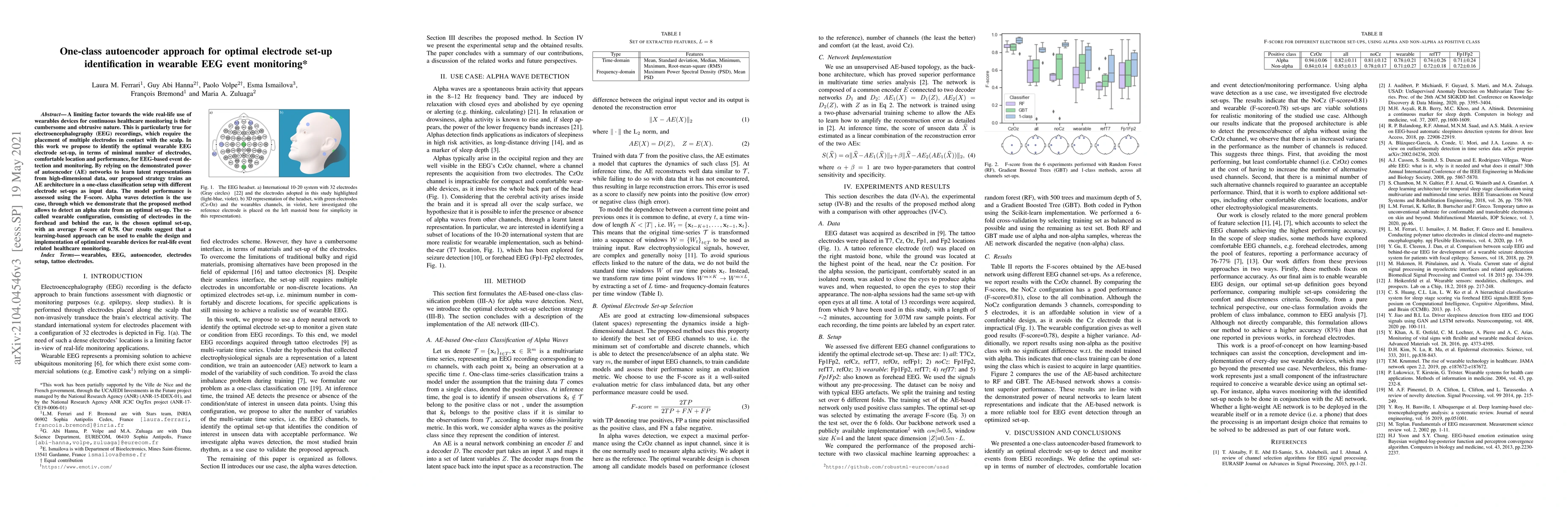 A limiting factor towards the wide routine use of wearables devices for continuous healthcare monitoring is their cumbersome and obtrusive nature. This is particularly true for electroencephalography (EEG) recordings, which require the placement of multiple electrodes in contact with the scalp. In this work, we propose to identify the optimal wearable EEG electrode set-up, in terms of minimal number of electrodes, comfortable location and performance, for EEG-based event detection and monitoring. By relying on the demonstrated power of autoencoder (AE) networks to learn latent representations from high-dimensional data, our proposed strategy trains an AE architecture in a one-class classification setup with different electrode set-ups as input data. The resulting models are assessed using the F-score and the best set-up is chosen according to the established optimal criteria. Using alpha wave detection as use case, we demonstrate that the proposed method allows to detect an alpha state from an optimal set-up consisting of electrodes in the forehead and behind the ear, with an average F-score of 0.78. Our results suggest that a learning-based approach can be used to enable the design and implementation of optimized wearable devices for real-life healthcare monitoring.