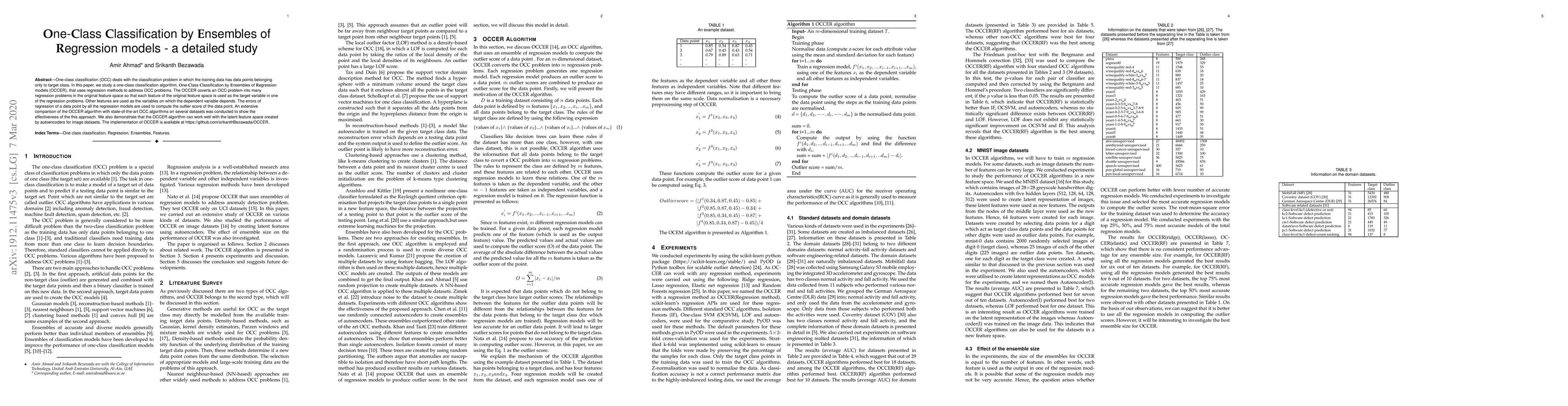 This paper presents the One-Class Classification by Ensembles of Regression models (OCCER) algorithm, which transforms one-class classification into multiple regression problems. The algorithm evaluates data points based on the regression errors, demonstrating effectiveness through comparisons with other methods and showing potential when applied to latent feature spaces from autoencoders.