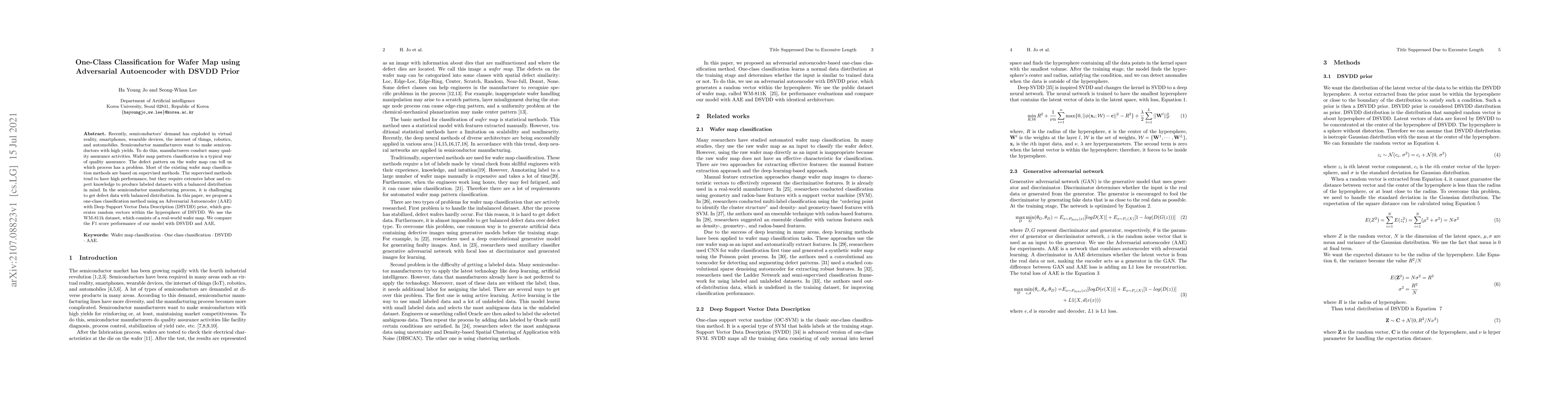 This paper proposes a one-class classification method using an Adversarial Autoencoder with a Deep Support Vector Data Description prior for wafer map pattern classification. The method aims to identify defects without requiring labeled datasets, addressing the challenge of obtaining balanced defect data in semiconductor manufacturing.