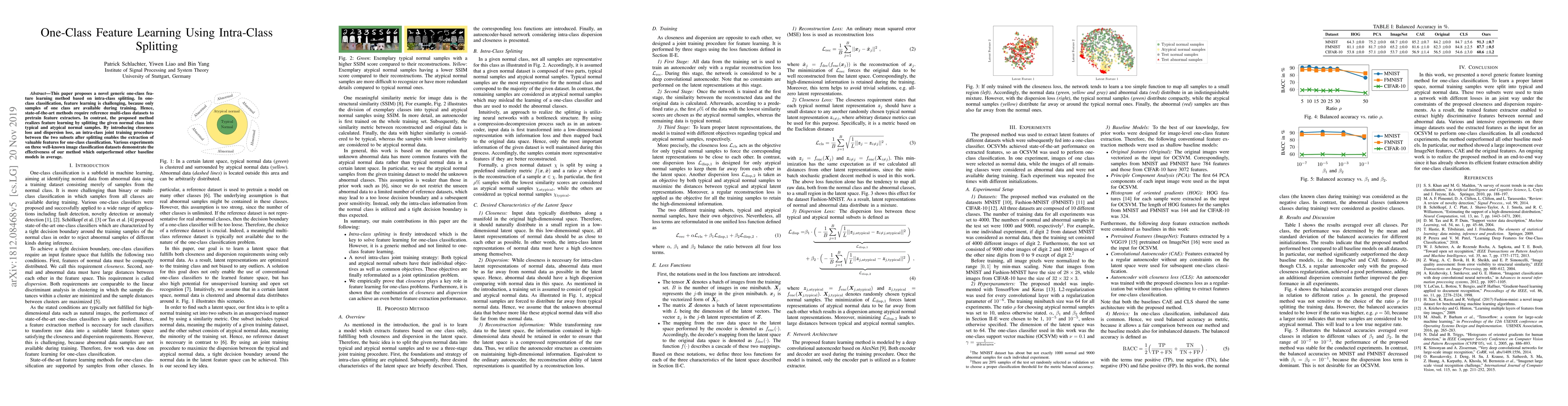 This paper introduces a novel one-class feature learning method based on intra-class splitting, which splits the normal class into typical and atypical samples to extract features without requiring multi-class datasets. Experiments show it outperforms baseline models on image classification tasks.