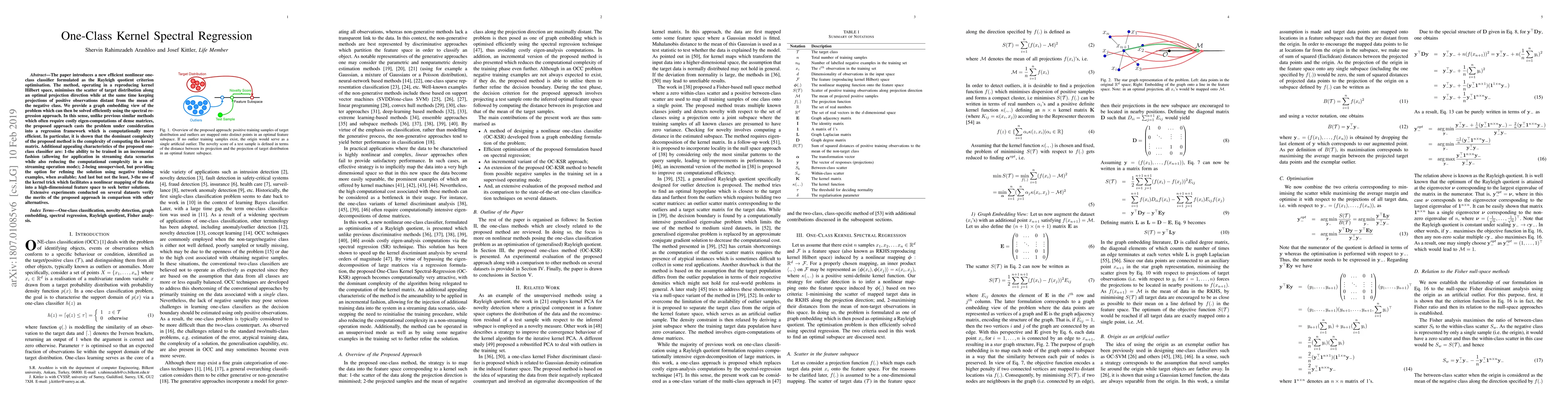 The paper proposes an efficient nonlinear one-class classifier using kernel spectral regression, optimizing the Rayleigh quotient in a reproducing kernel Hilbert space. It minimizes target distribution scatter while keeping positive observations distant from negative class means, offering computational efficiency and incremental training capabilities.