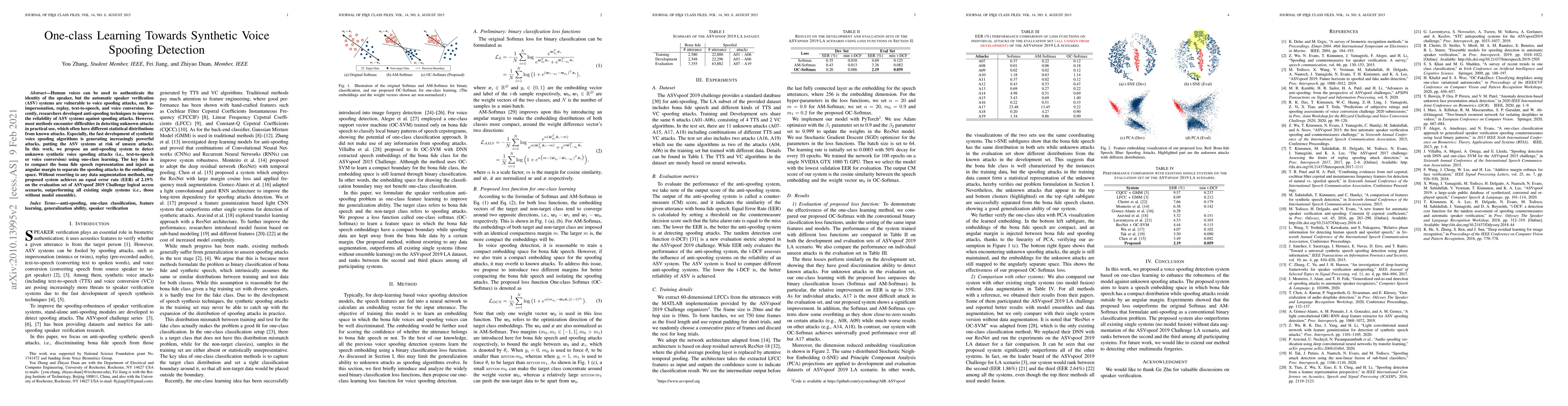 This paper proposes an anti-spoofing system using one-class learning to detect unknown synthetic voice attacks, achieving an EER of 2.19% on the ASVspoof 2019 Challenge. The method compacts bona fide speech representation and injects an angular margin to distinguish spoofing attacks without data augmentation.