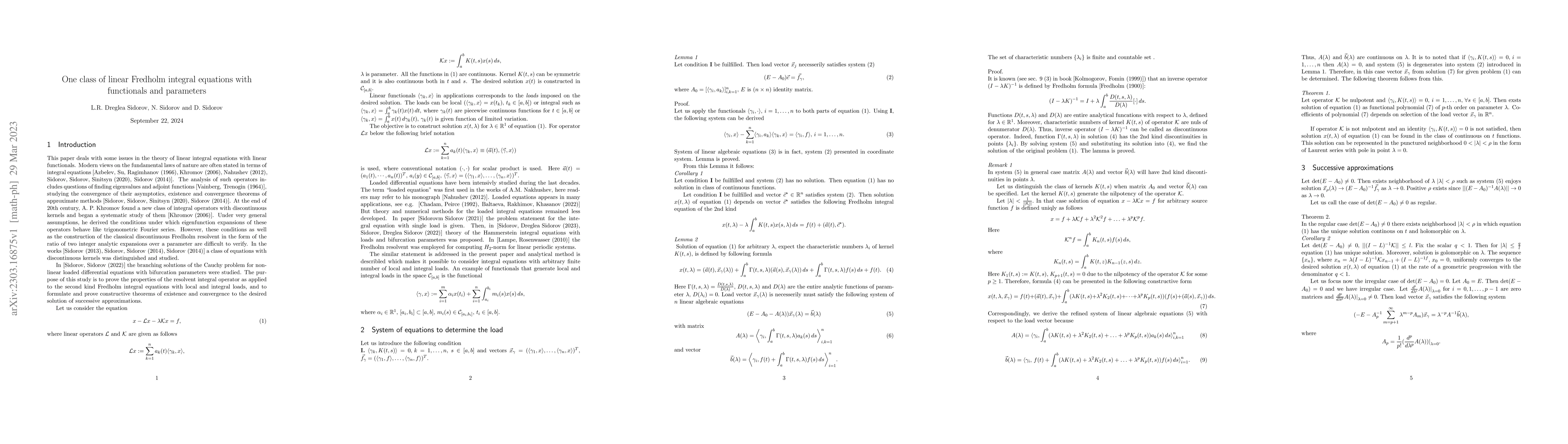 The theory of linear Fredholm integral-functional equations of the second kind with linear functionals and with a parameter is considered. The necessary and sufficient conditions are obtained for the coefficients of the equation and those parameter values, in the nighbohood of which the equation has solutions. The leading terms of the asymptotics of the solutions are constructed. The constructive method is proposed for constructing a solution both in the regular case and in the irregular one. In the regular case, the solution is constructed as a Taylor series in powers of the parameter. In the irregular case, the solution is constructed as a Laurent series in powers of the parameter. Constructive theory and method is demonstrated on the model example.