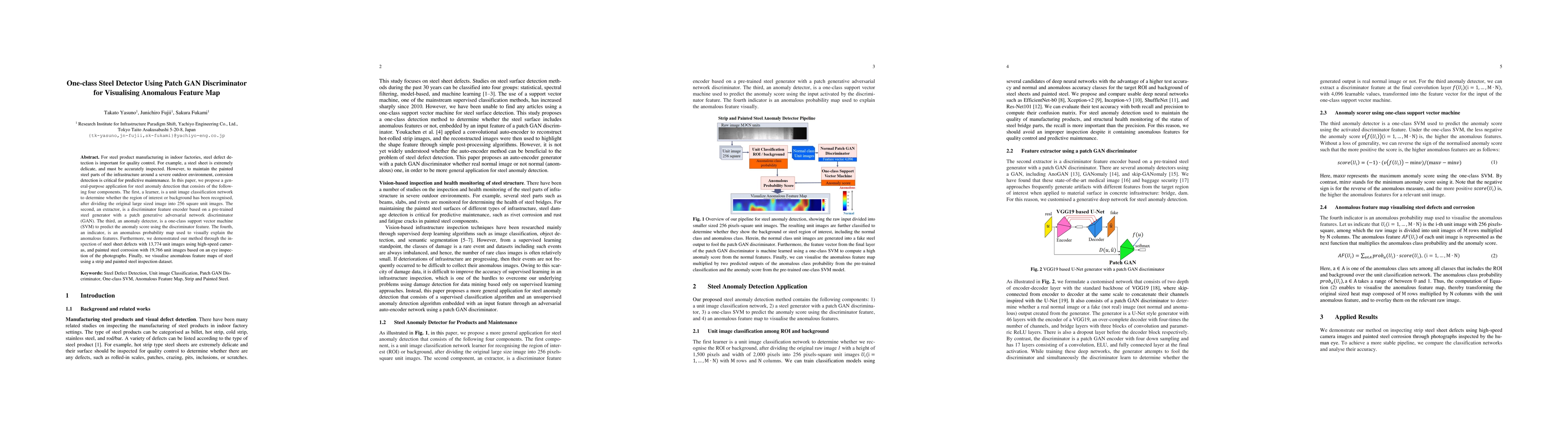 This paper proposes a steel anomaly detection system using a patch GAN discriminator for visualising anomalous feature maps. It employs a learner, extractor, anomaly detector, and indicator to identify defects in steel sheets and corrosion in painted steel, validated with extensive datasets.