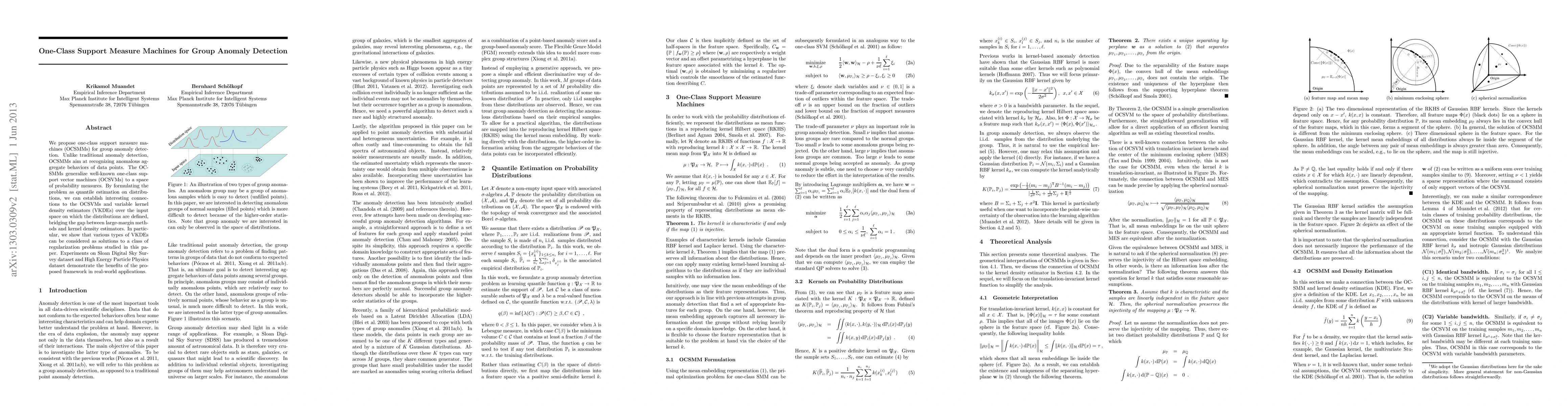 This paper introduces one-class support measure machines (OCSMMs) for group anomaly detection, generalizing one-class support vector machines (OCSVMs) to probability measures. It connects OCSVMs and variable kernel density estimators (VKDEs), showing how VKDEs solve regularization problems, and demonstrates the effectiveness of OCSMMs on real datasets.