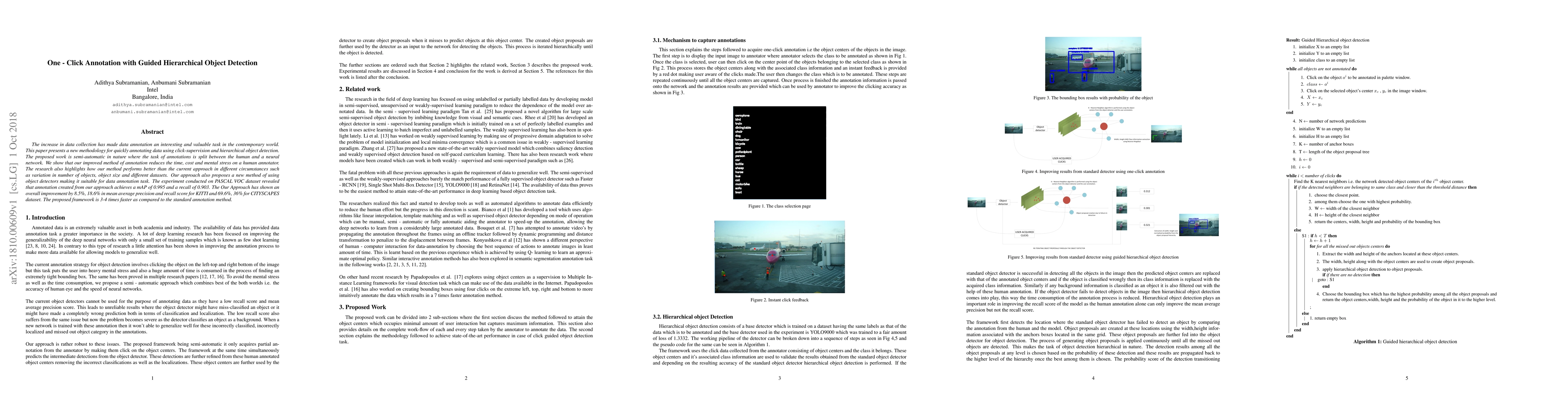This paper introduces a semi-automatic annotation method using click-supervision and hierarchical object detection, significantly reducing annotation time and cost while improving accuracy. Experiments on PASCAL VOC, KITTI, and CITYSCAPES datasets show notable improvements in mean average precision and recall, and a 3-4 times faster annotation process compared to standard methods.