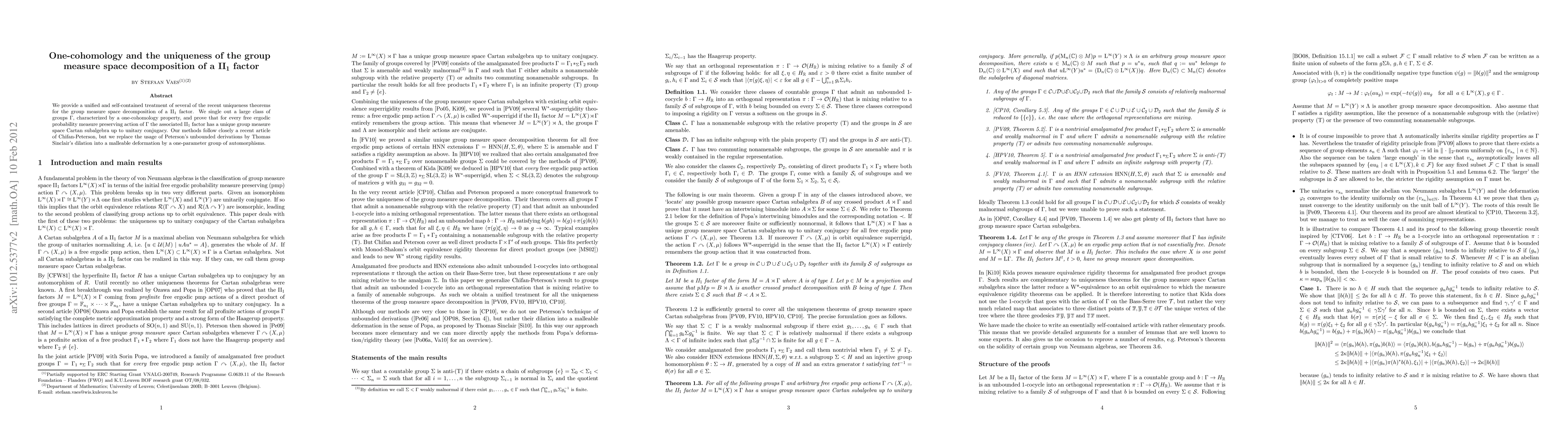 This paper proves uniqueness in the group measure space decomposition for II_1 factors under free ergodic actions of a specified class of groups \(\Gamma\), characterized by a one-cohomology property. The authors replace Peterson's unbounded derivations with Sinclair's dilation method for automorphisms, providing a novel approach to the topic.