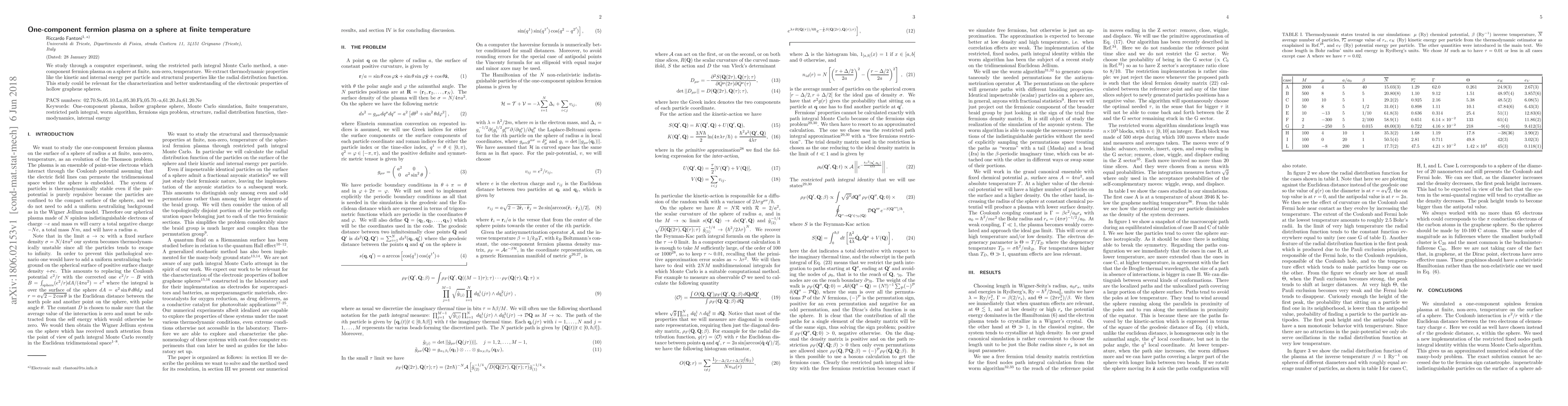 We study through a computer experiment, using the restricted path integral Monte Carlo method, a one-component fermion plasma on a sphere at finite, non-zero, temperature. We extract thermodynamic properties like the kinetic and internal energy per particle and structural properties like the radial distribution function. This study could be relevant for the characterization and better understanding of the electronic properties of hollow graphene spheres.