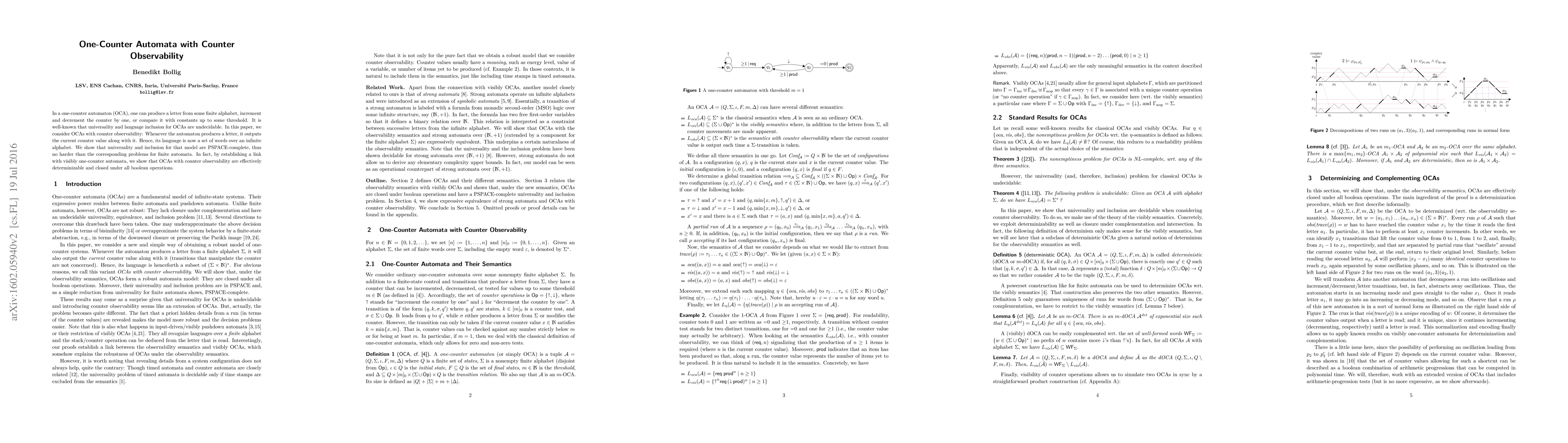 The paper presents a detailed analysis of One-Counter Automata (OCA) with counter observability, transforming them into Deterministic One-Counter Automata (DOCA) and proving their effective determinizability and closure under boolean operations.