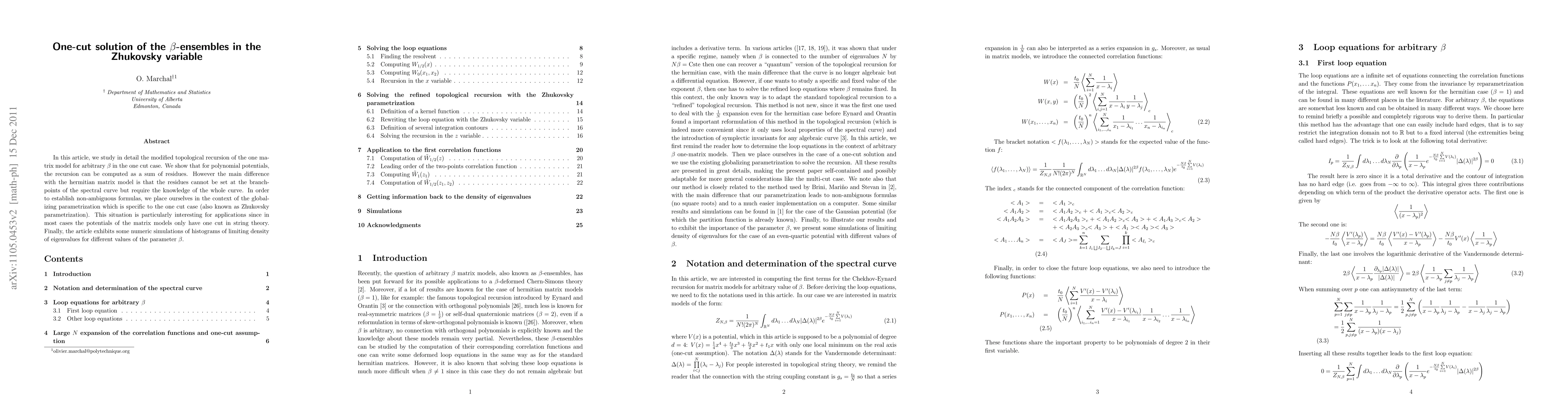 In this article, we study in detail the modified topological recursion of the one matrix model for arbitrary $\beta$ in the one cut case. We show that for polynomial potentials, the recursion can be computed as a sum of residues. However the main difference with the hermitian matrix model is that the residues cannot be set at the branchpoints of the spectral curve but require the knowledge of the whole curve. In order to establish non-ambiguous formulas, we place ourselves in the context of the globalizing parametrization which is specific to the one cut case (also known as Zhukovsky parametrization). This situation is particularly interesting for applications since in most cases the potentials of the matrix models only have one cut in string theory. Finally, the article exhibits some numeric simulations of histograms of limiting density of eigenvalues for different values of the parameter $\beta$.