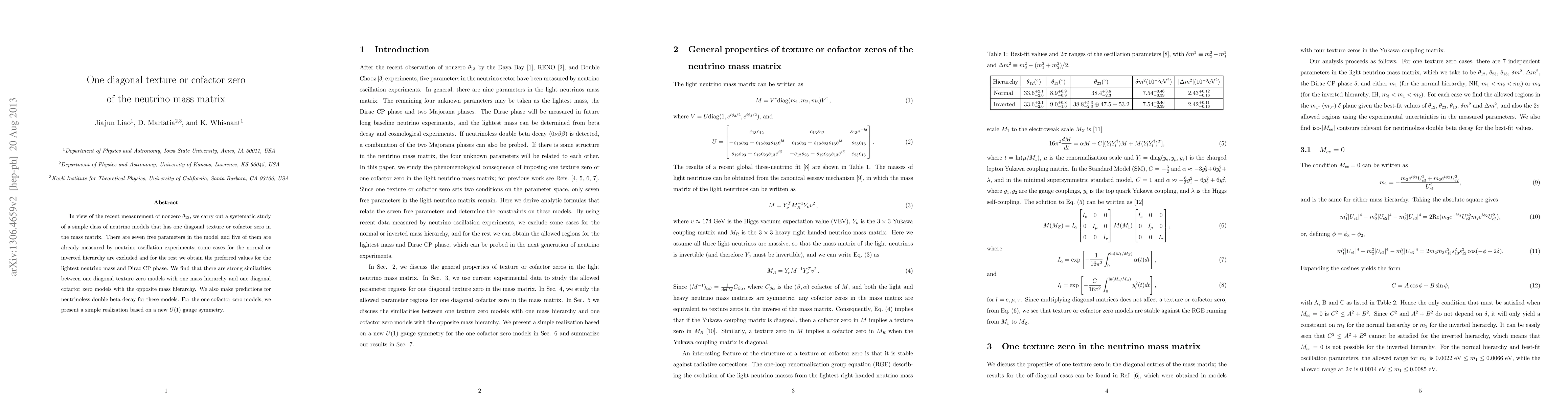 This paper investigates neutrino mass models with one diagonal texture or cofactor zero, finding strong similarities between these models and predicting preferred values for the lightest neutrino mass and Dirac CP phase. The study also predicts outcomes for neutrinoless double beta decay and proposes a new U(1) gauge symmetry realization for cofactor zero models.