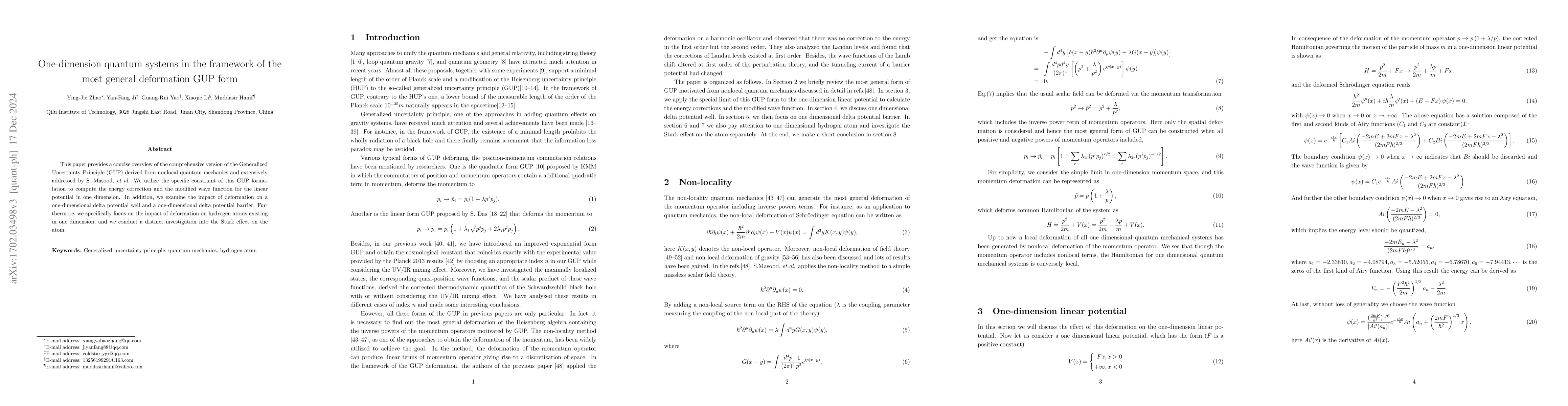 In this paper we briefly review the most general form of GUP motivated from nonlocal quantum mechanics discussed in detail by S. Masood, {\em et al}. We apply the special limit of this GUP form to the one-dimension linear potential to calculate the energy correction and the modified wave function. We also discuss the deformation effect on one dimensional delta potential well and one dimensional delta potential barrier. Moreover, we pay attention to the deformation effect on one dimensional hydrogen atom and investigate the Stark effect on the atom separately. Finally, we make a short conclusion.