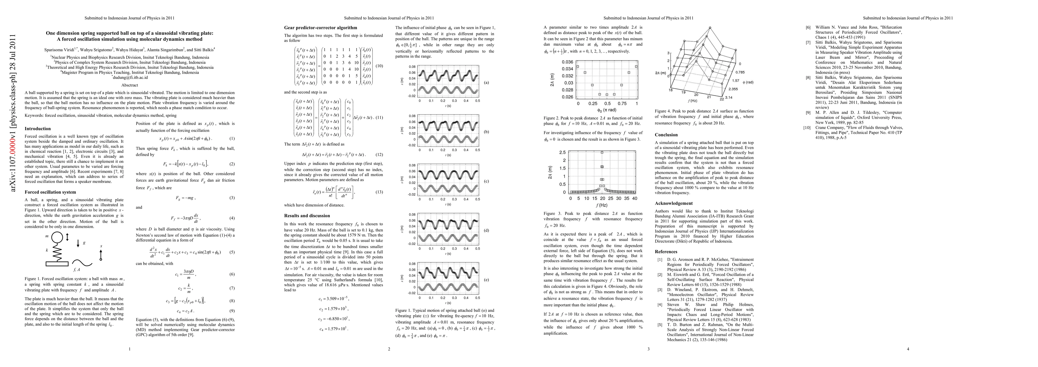 Summary: This study simulates a one-dimensional forced oscillation of a ball on a sinusoidally vibrating plate using molecular dynamics. Resonance occurs when the plate's vibration frequency matches the ball-spring system's frequency, highlighting the necessity of a phase match condition.