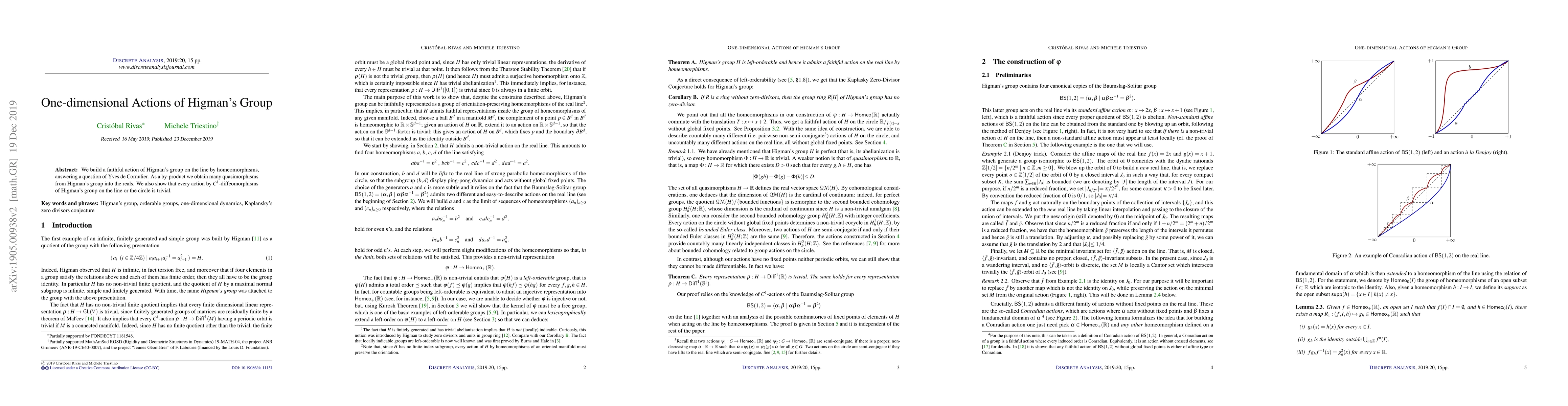 Summary: This paper constructs a faithful action of Higman's group on the real line, addressing a question posed by Yves de Cornulier, and demonstrates that any $C^1$-diffeomorphism action of the group on the line or circle is trivial.