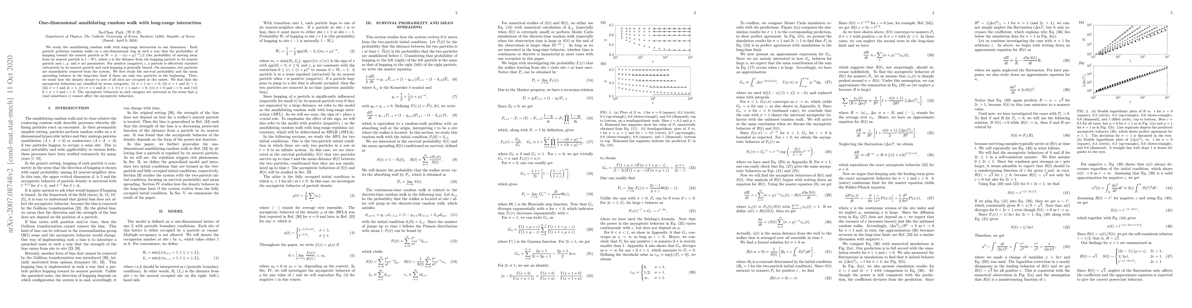 Researchers studied a one-dimensional random walk with long-range interaction where particles interact via a specific probability function. They found seven universal asymptotic behaviors classified by parameter combinations that determine the system's survival probability, mean spreading, and density decay.