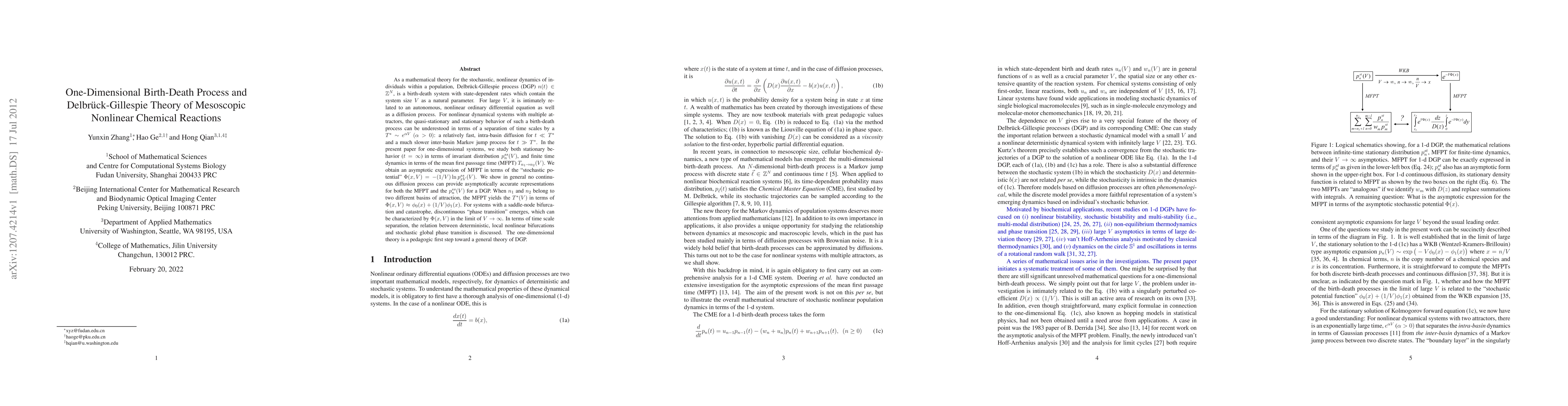 As a mathematical theory for the stochasstic, nonlinear dynamics of individuals within a population, Delbr\"{u}ck-Gillespie process (DGP) $n(t)\in\mathbb{Z}^N$, is a birth-death system with state-dependent rates which contain the system size $V$ as a natural parameter. For large $V$, it is intimately related to an autonomous, nonlinear ordinary differential equation as well as a diffusion process. For nonlinear dynamical systems with multiple attractors, the quasi-stationary and stationary behavior of such a birth-death process can be underestood in terms of a separation of time scales by a $T^*\sim e^{\alpha V}$ $(\alpha>0)$: a relatively fast, intra-basin diffusion for $t\ll T^*$ and a much slower inter-basin Markov jump process for $t\gg T^*$. In the present paper for one-dimensional systems, we study both stationary behavior ($t=\infty$) in terms of invariant distribution $p_n^{ss}(V)$, and finite time dynamics in terms of the mean first passsage time (MFPT) $T_{n_1\rightarrow n_2}(V)$. We obtain an asymptotic expression of MFPT in terms of the "stochastic potential" $\Phi(x,V)=-(1/V)\ln p^{ss}_{xV}(V)$. We show in general no continuous diffusion process can provide asymptotically accurate representations for both the MFPT and the $p_n^{ss}(V)$ for a DGP. When $n_1$ and $n_2$ belong to two different basins of attraction, the MFPT yields the $T^*(V)$ in terms of $\Phi(x,V)\approx \phi_0(x)+(1/V)\phi_1(x)$. For systems with a saddle-node bifurcation and catastrophe, discontinuous "phase transition" emerges, which can be characterized by $\Phi(x,V)$ in the limit of $V\rightarrow\infty$. In terms of time scale separation, the relation between deterministic, local nonlinear bifurcations and stochastic global phase transition is discussed. The one-dimensional theory is a pedagogic first step toward a general theory of DGP.
