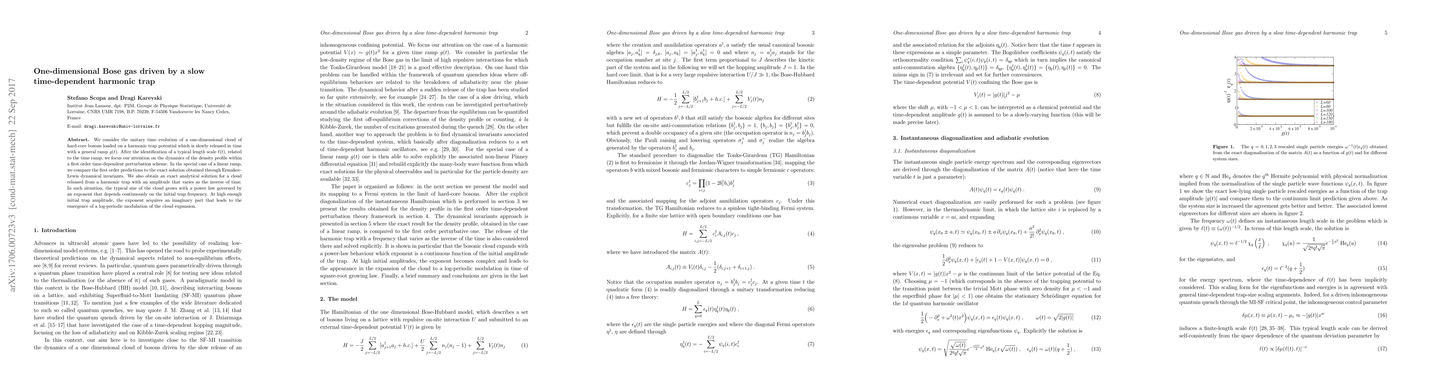 The paper investigates the dynamics of a one-dimensional cloud of hard-core bosons in a time-dependent harmonic trap, identifying a length scale related to the time ramp. Using perturbation theory, it predicts the cloud's density profile evolution for various ramp functions, comparing these predictions to exact solutions for linear and inverse-time ramps. The study uncovers power-law growth of the cloud size with imaginary exponents causing log-periodic modulations at high initial trap amplitudes.