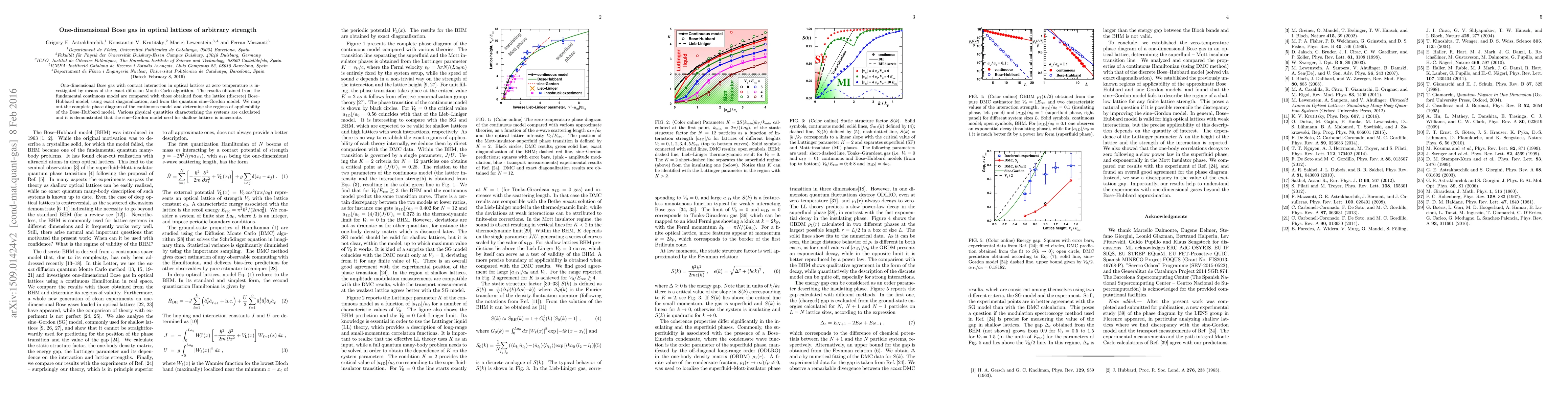 This paper investigates a one-dimensional Bose gas in optical lattices using exact diffusion Monte Carlo, comparing results with the Bose-Hubbard and quantum sine-Gordon models. It maps out the phase diagram and determines the applicability of the Bose-Hubbard model, showing the sine-Gordon model's inaccuracy for shallow lattices.