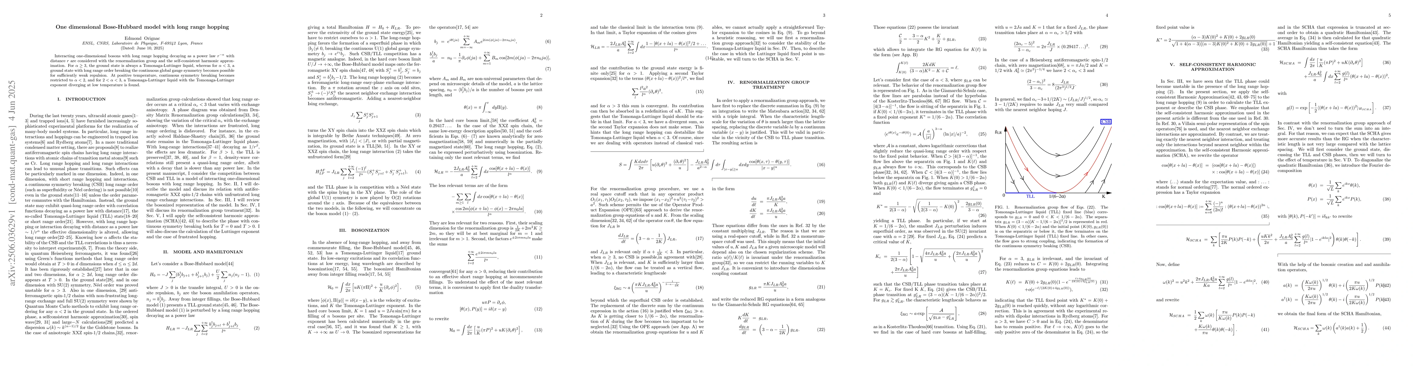 The application of renormalization group and self-consistent harmonic approximation to analyze the one-dimensional Bose-Hubbard model with long-range hopping, revealing distinct phases based on the value of $\alpha$.