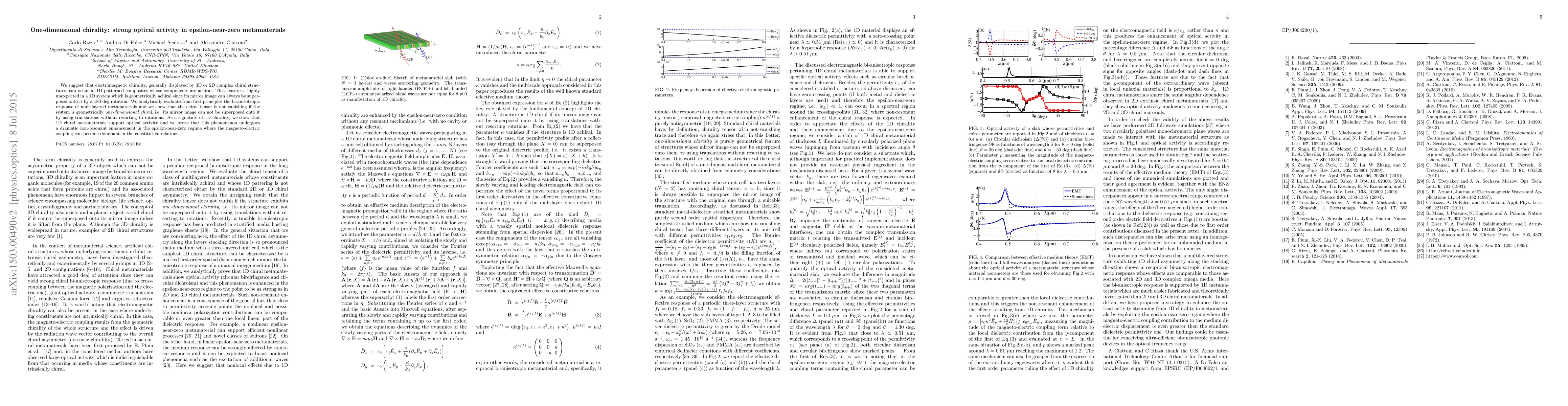 We suggest that electromagnetic chirality, generally displayed by 3D or 2D complex chiral structures, can occur in 1D patterned composites whose components are achiral. This feature is highly unexpected in a 1D system which is geometrically achiral since its mirror image can always be superposed onto it by a 180 deg rotation. We analytically evaluate from first principles the bi-anisotropic response of multilayered metamaterials and we show that the chiral tensor is not vanishing if the system is geometrically one-dimensional chiral, i.e. its mirror image can not be superposed onto it by using translations without resorting to rotations. As a signature of 1D chirality, we show that 1D chiral metamaterials support optical activity and we prove that this phenomenon undergoes a dramatic non-resonant enhancement in the epsilon-near-zero regime where the magneto-electric coupling can become dominant in the constitutive relations.