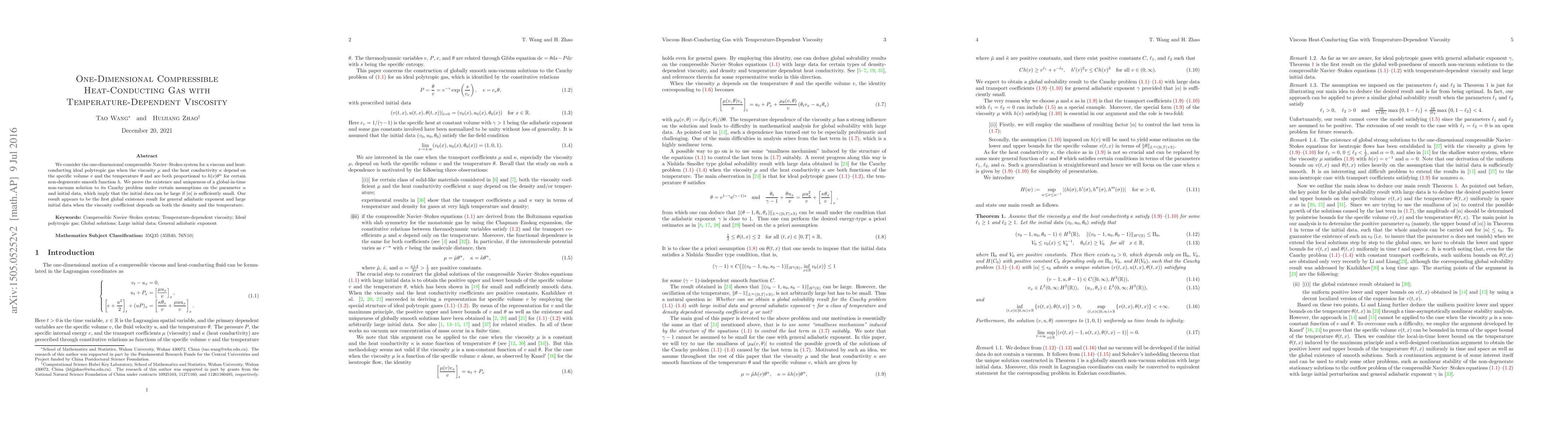 This paper proves the existence and uniqueness of a global-in-time non-vacuum solution for the one-dimensional compressible Navier-Stokes system of a viscous, heat-conducting polytropic gas, where viscosity and heat conductivity depend on specific volume and temperature. The result is the first global existence proof for large initial data under general adiabatic conditions.
