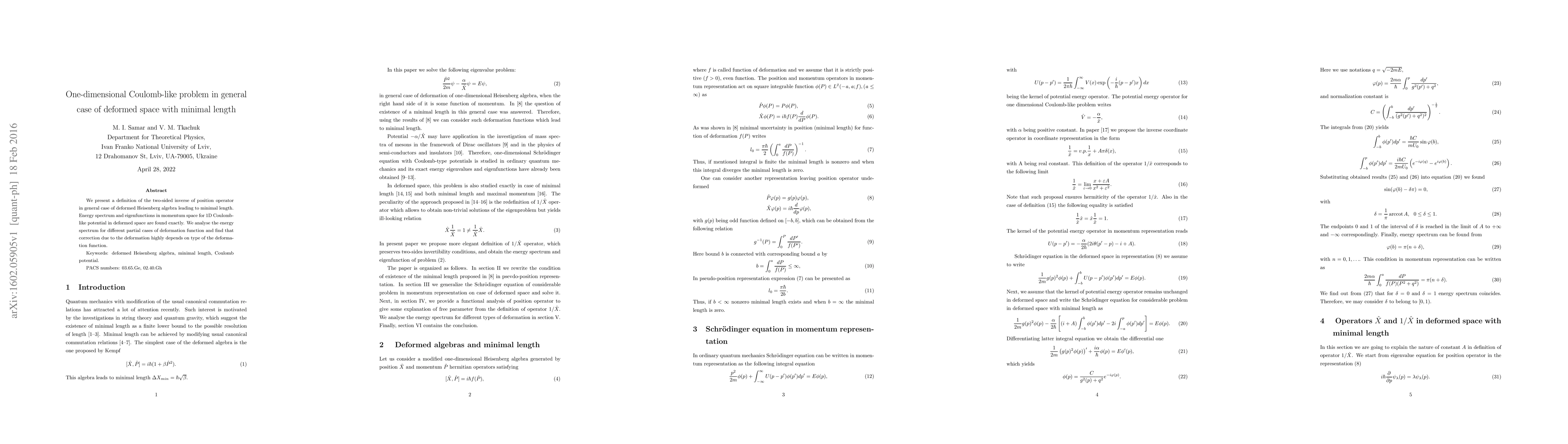 This paper defines the two-sided inverse of the position operator in deformed Heisenberg algebra, leading to a minimal length. It derives the exact energy spectrum and eigenfunctions for a 1D Coulomb-like potential in deformed space, showing that deformation corrections depend significantly on the specific deformation function.