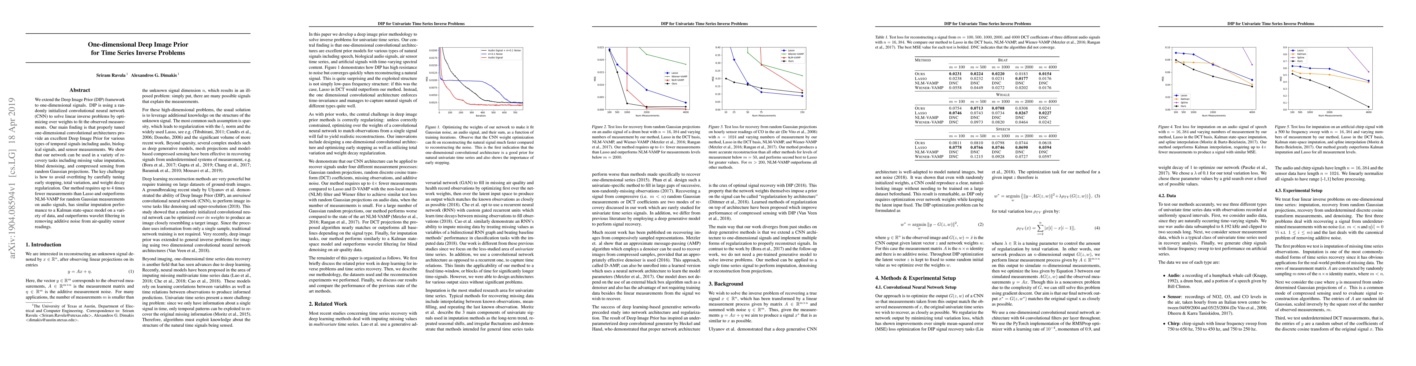 A new approach called One-dimensional Deep Image Prior uses neural networks to solve inverse problems in time series data, requiring fewer measurements than traditional methods and outperforming others in various tasks.