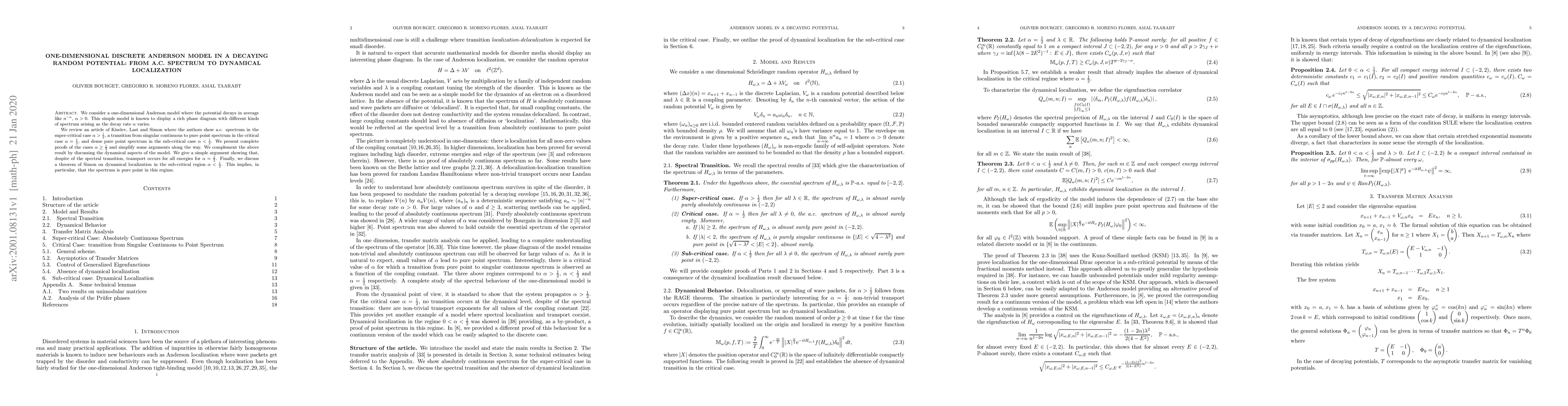We consider a one-dimensional Anderson model where the potential decays in average like $n^{-\alpha}$, $\alpha>0$. This simple model is known to display a rich phase diagram with different kinds of spectrum arising as the decay rate $\alpha$ varies. We review an article of Kiselev, Last and Simon where the authors show a.c. spectrum in the super-critical case $\alpha>\frac12$, a transition from singular continuous to pure point spectrum in the critical case $\alpha=\frac12$, and dense pure point spectrum in the sub-critical case $\alpha<\frac12$. We present complete proofs of the cases $\alpha\ge\frac12$ and simplify some arguments along the way. We complement the above result by discussing the dynamical aspects of the model. We give a simple argument showing that, despite of the spectral transition, transport occurs for all energies for $\alpha=\frac12$. Finally, we discuss a theorem of Simon on dynamical localization in the sub-critical region $\alpha<\frac12$. This implies, in particular, that the spectrum is pure point in this regime.