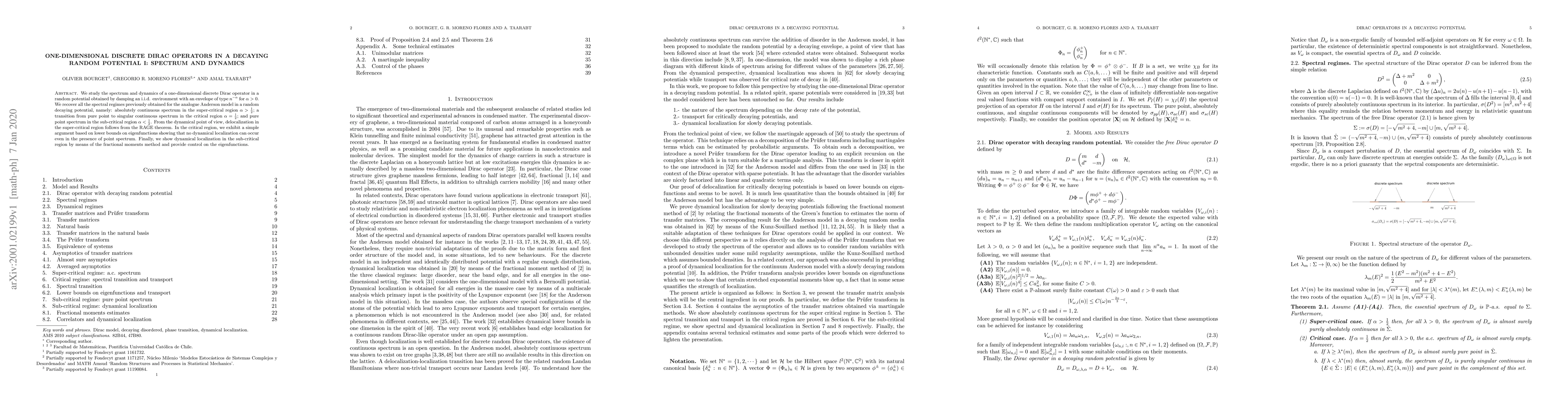 This paper investigates the spectrum and dynamics of a one-dimensional discrete Dirac operator in a decaying random potential, identifying three spectral regimes and demonstrating dynamical localization behaviors across different critical thresholds. The study confirms the transition from pure point to singular continuous spectrum at the critical point.