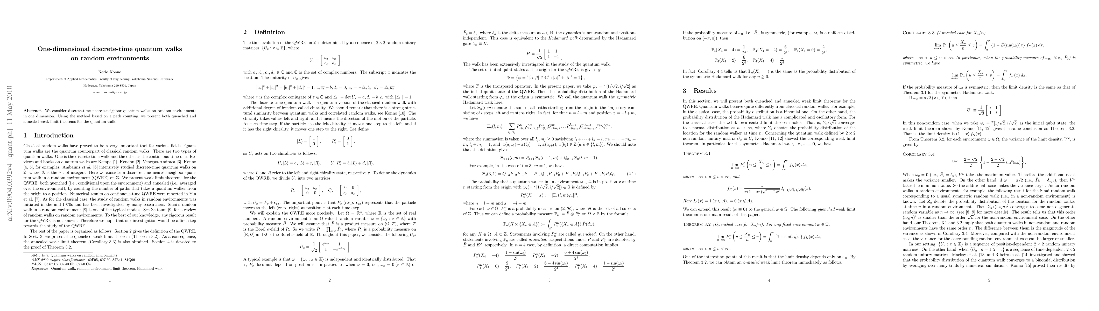 Summary: This paper investigates discrete-time quantum walks in one-dimensional random environments, presenting both quenched and annealed weak limit theorems through a path counting method. The findings provide insights into the behavior of quantum walks under stochastic influences.
