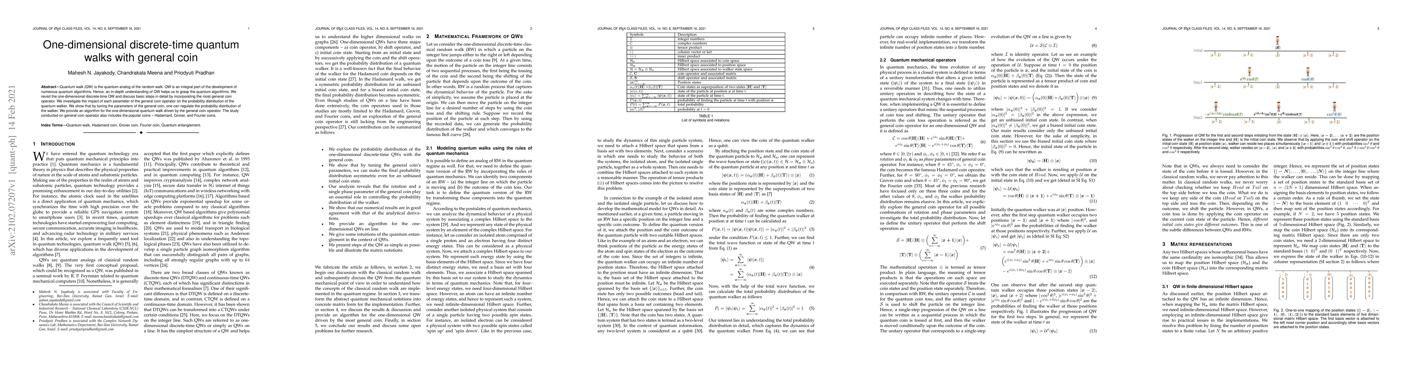 This paper explores one-dimensional discrete-time quantum walks (QW) using the most general coin operator, examining how different parameters influence the walker's probability distribution. It presents an algorithm for the QW driven by a general coin and demonstrates the ability to regulate the distribution by tuning the coin parameters, including specific popular coins like Hadamard, Grover, and Fourier.