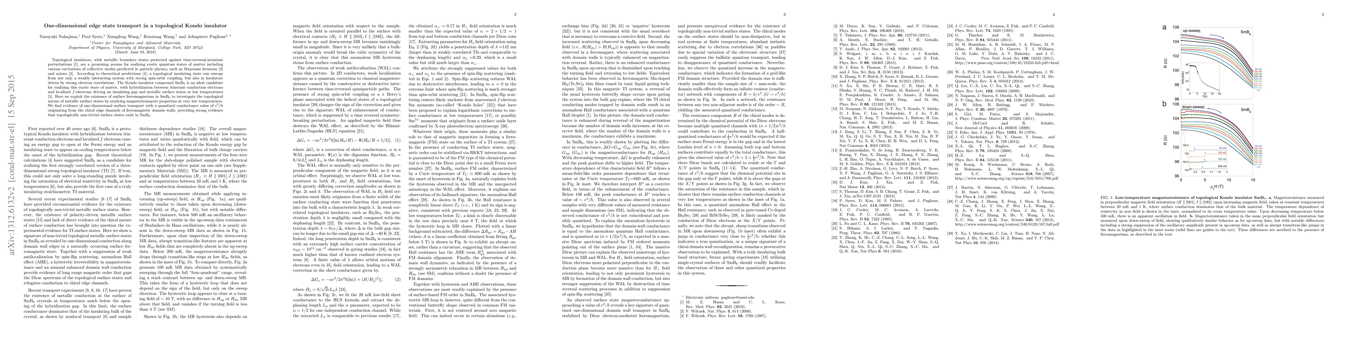 This paper explores the topological nature of metallic surface states in the Kondo insulator SmB6, revealing one-dimensional edge state transport with quantized conductance, indicative of chiral edge channels from ferromagnetic domain walls, confirming the presence of topologically non-trivial surface states.