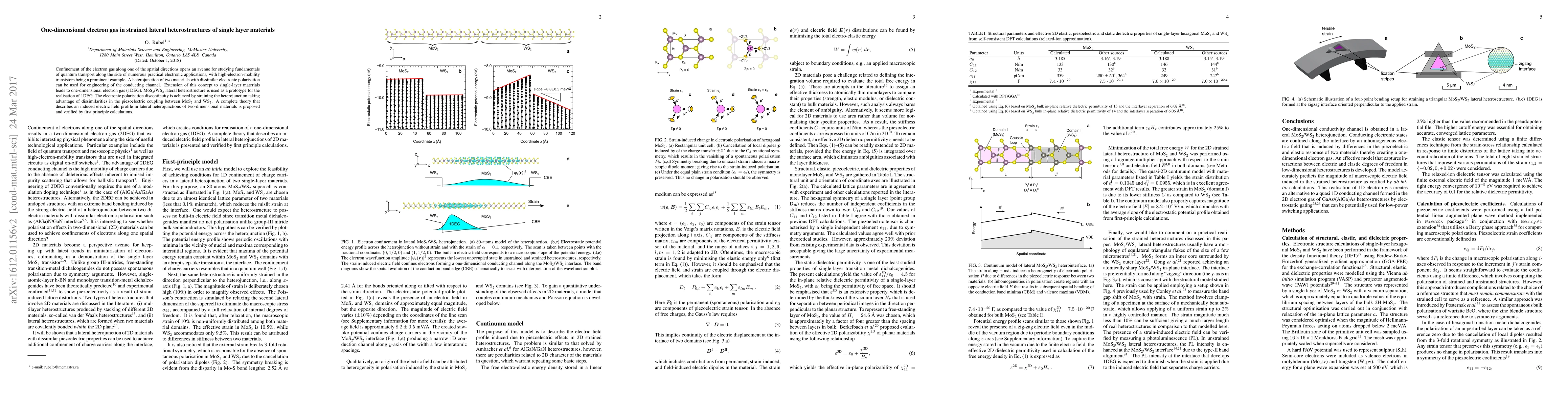 This research investigates the creation of a one-dimensional electron gas (1DEG) in strained lateral heterostructures of single-layer materials, specifically MoS2/WS2, to explore quantum transport fundamentals for practical applications like high-electron-mobility transistors. A theoretical model is developed and validated through first-principle calculations to describe the induced electric field profile due to the piezoelectric coupling differences between MoS2 and WS2.