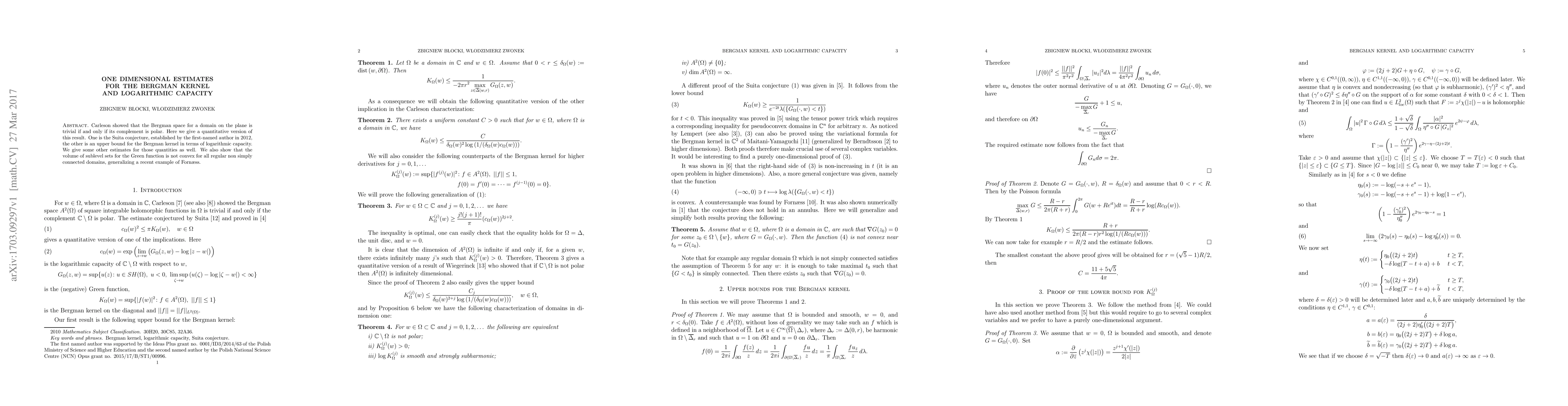 Carleson showed that the Bergman space for a domain on the plane is trivial if and only if its complement is polar. Here we give a quantitative version of this result. One is the Suita conjecture, established by the first-named author in 2012, the other is an upper bound for the Bergman kernel in terms of logarithmic capacity. We give some other estimates for those quantities as well. We also show that the volume of sublevel sets for the Green function is not convex for all regular non simply connected domains, generalizing a recent example of Forn\ae ss.