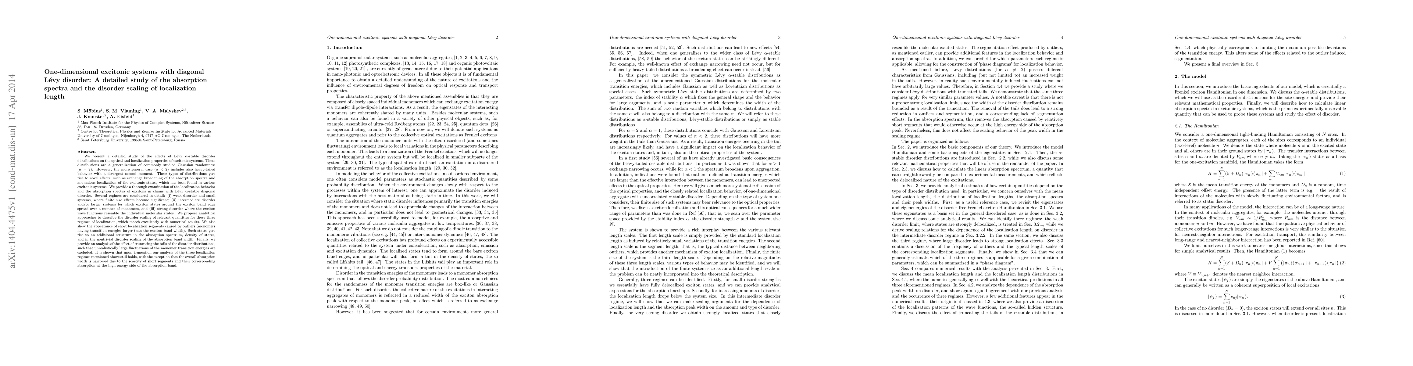 We present a detailed study of the effects of L\'evy $\alpha$-stable disorder distributions on the optical and localization properties of excitonic systems. These distributions are a generalization of commonly studied Gaussian randomness ($\alpha = 2$). However, the more general case ($\alpha < 2$) includes also heavy-tailed behavior with a divergent second moment. These types of distributions give rise to novel effects, such as exchange broadening of the absorption spectra and anomalous localization of the excitonic states, which has been found in various excitonic systems. We provide a thorough examination of the localization behavior and the absorption spectra of excitons in chains with L\'evy $\alpha$-stable diagonal disorder. Several regimes are considered in detail: (i) weak disorder and small systems, where finite size effects become significant; (ii) intermediate disorder and/or larger systems for which exciton states around the exciton band edge spread over a number of monomers, and (iii) strong disorder where the exciton wave functions resemble the individual molecular states. We propose analytical approaches to describe the disorder scaling of relevant quantities for these three regimes of localization, which match excellently with numerical results. We also show the appearance of short localization segments caused by outliers (monomers having transition energies larger than the exciton band width). Such states give rise to an additional structure in the absorption spectrum, density of states, and in the nontrivial disorder scaling of the absorption band width.