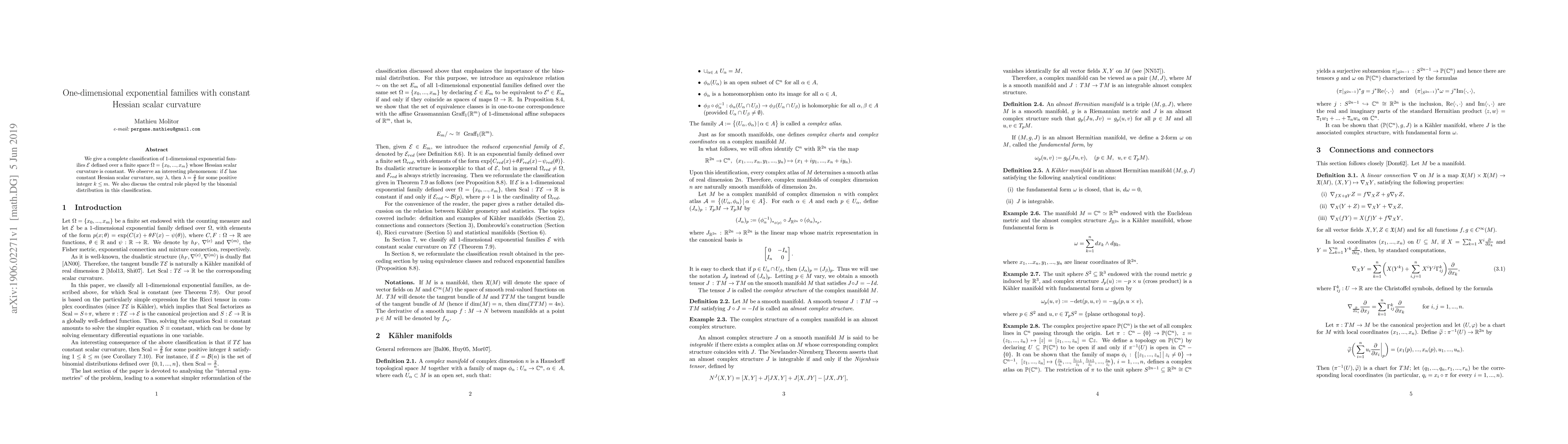 This paper classifies 1-dimensional exponential families with constant Hessian scalar curvature, finding that only those with a specific relationship to the binomial distribution have this property.