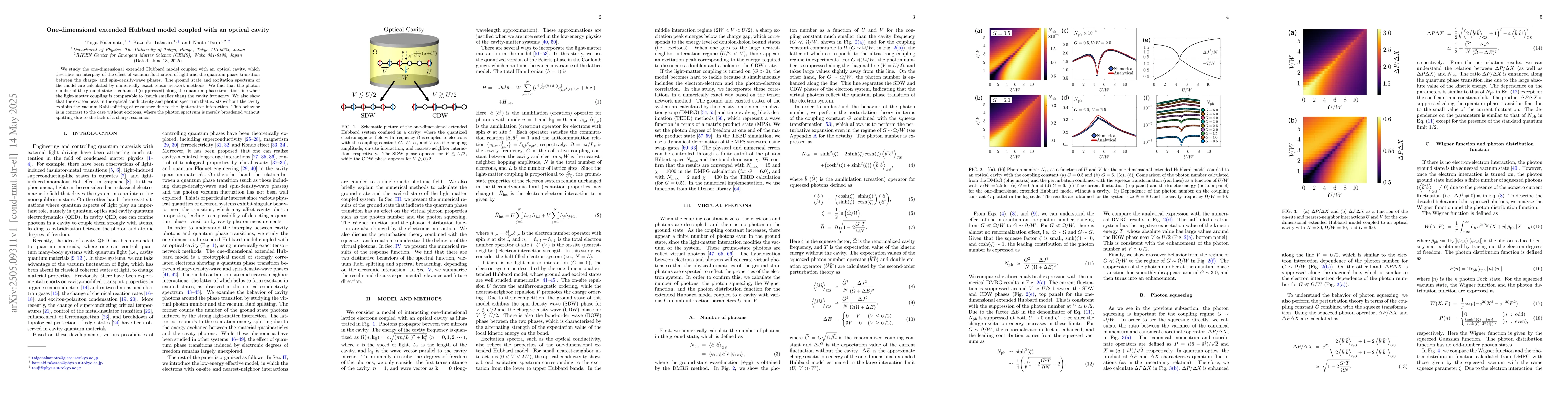 The paper presents a detailed analysis of the one-dimensional extended Hubbard model coupled with an optical cavity, revealing new insights into the ground state and excitation spectrum under varying light-matter coupling strengths.