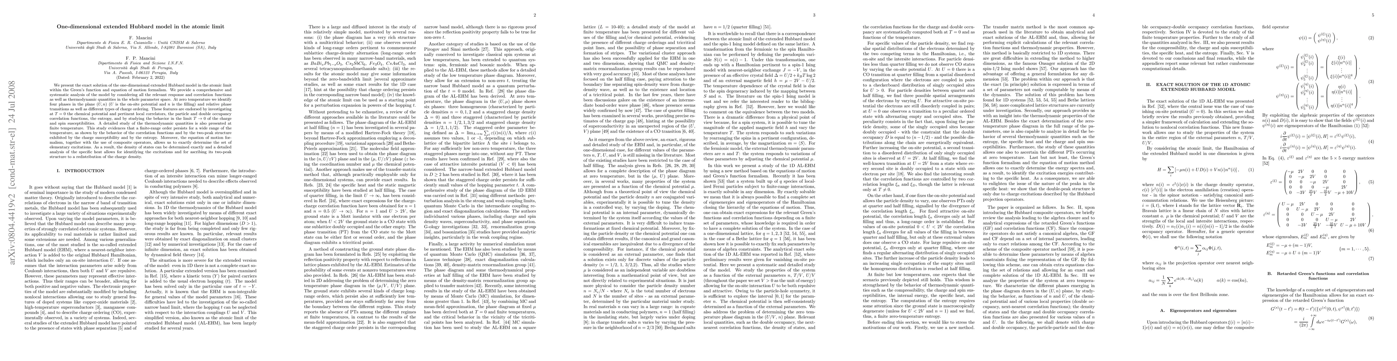 We present the exact solution of the one-dimensional extended Hubbard model in the atomic limit within the Green's function and equation of motion formalism. We provide a comprehensive and systematic analysis of the model by considering all the relevant response and correlation functions as well as thermodynamic quantities in the whole parameter space. At zero temperature we identify four phases in the plane (U,n) [U is the onsite potential and n is the filling] and relative phase transitions as well as different types of charge ordering. These features are endorsed by investigating at T=0 the chemical potential and pertinent local correlators, the particle and double occupancy correlation functions, the entropy, and by studying the behavior in the limit T going to zero of the charge and spin susceptibilities. A detailed study of the thermodynamic quantities is also presented at finite temperature. This study evidences that a finite-range order persists for a wide range of the temperature, as shown by the behavior of the correlation functions and by the two-peak structure exhibited by the charge susceptibility and by the entropy. Moreover, the equation of motion formalism, together with the use of composite operators, allows us to exactly determine the set of elementary excitations. As a result, the density of states can be determined exactly and a detailed analysis of the specific heat allows for identifying the excitations and for ascribing its two-peak structure to a redistribution of the charge density.