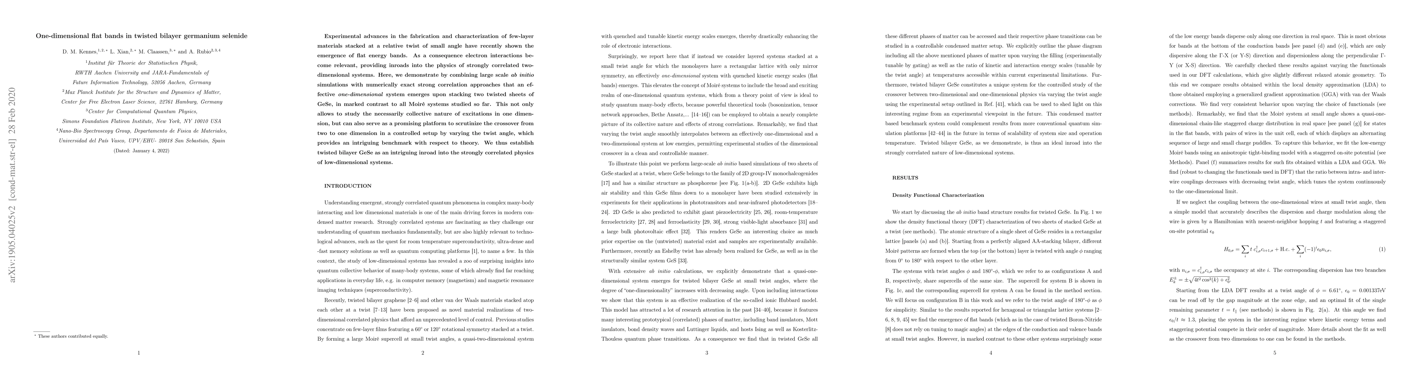 Experimental advances in the fabrication and characterization of few-layer materials stacked at a relative twist of small angle have recently shown the emergence of flat energy bands. As a consequence electron interactions become relevant, providing inroads into the physics of strongly correlated two-dimensional systems. Here, we demonstrate by combining large scale ab initio simulations with numerically exact strong correlation approaches that an effective one-dimensional system emerges upon stacking two twisted sheets of GeSe, in marked contrast to all Moir\'e systems studied so far. This not only allows to study the necessarily collective nature of excitations in one dimension, but can also serve as a promising platform to scrutinize the crossover from two to one dimension in a controlled setup by varying the twist angle, which provides an intriguing benchmark with respect to theory. We thus establish twisted bilayer GeSe as an intriguing inroad into the strongly correlated physics of low-dimensional systems.