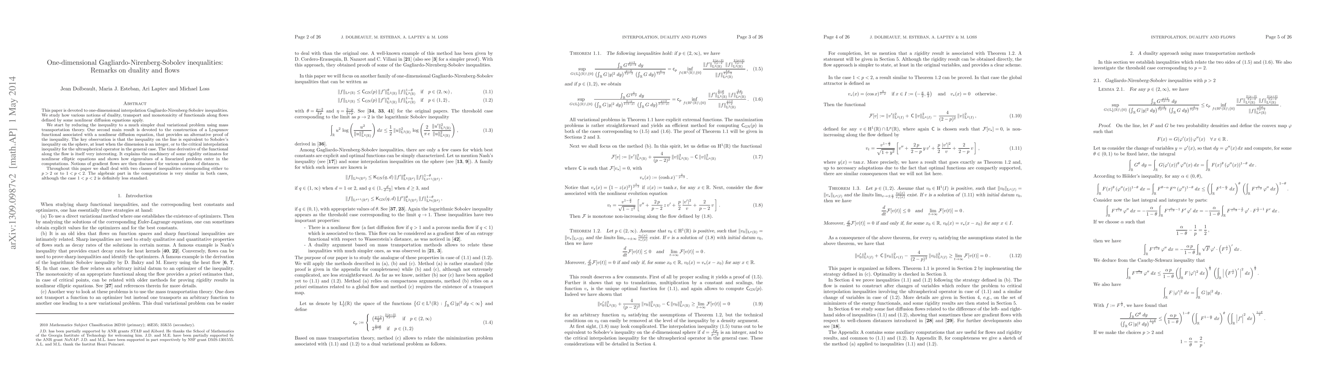This paper explores one-dimensional Gagliardo-Nirenberg-Sobolev inequalities, utilizing mass transportation theory to simplify the inequality into a dual variational problem and constructing a Lyapunov functional for alternative proofs. The study also examines the time derivative of the functional along flows and its implications for rigidity estimates and eigenvalues in nonlinear elliptic equations.
