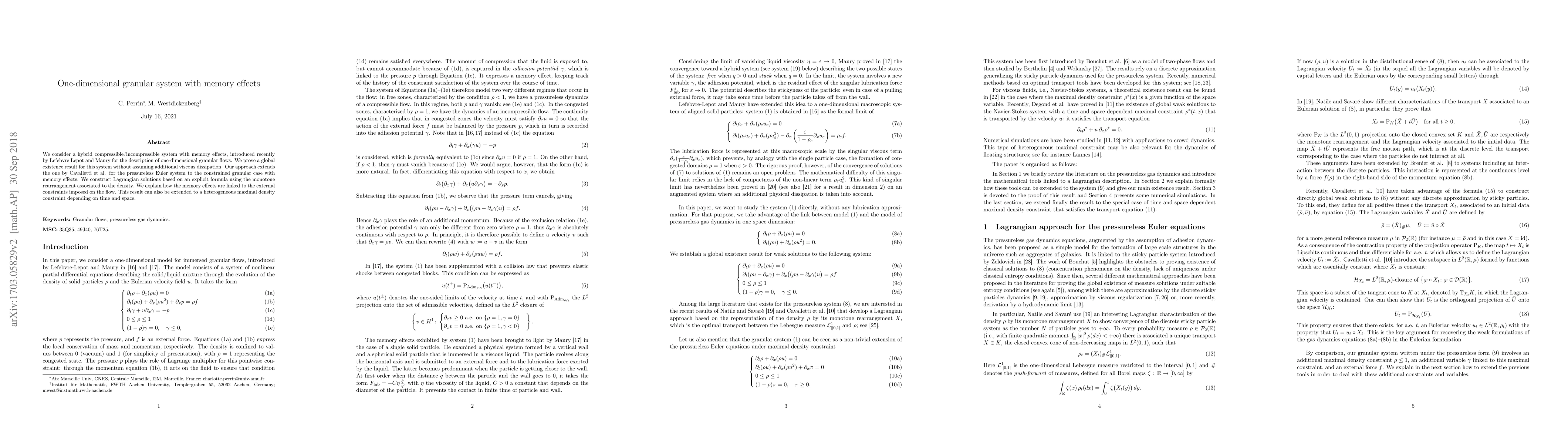 We consider a hybrid compressible/incompressible system with memory effects introduced by Lefebvre Lepot and Maury (2011) for the description of one-dimensional granular flows. We prove a first global existence result for this system without additional viscous dissipation. Our approach extends the one by Cavalletti, Sedjro, Westdickenberg (2015) for the pressureless Euler system to the constraint granular case with memory effects. We construct Lagrangian solutions based on an explicit formula of the monotone rearrangement associated to the density and explain how the memory effects are linked to the external constraints imposed on the flow. This result is finally extended to a heterogeneous maximal density constraint depending on time and space.