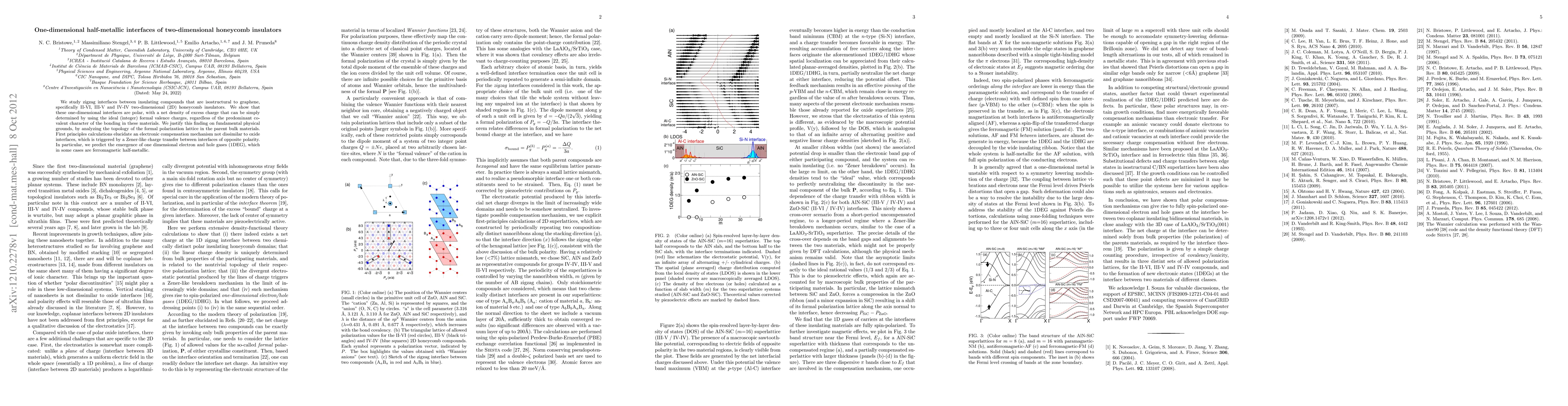 This paper investigates zigzag interfaces between insulating 2D honeycomb materials, revealing polar one-dimensional interfaces with excess charge determined by formal valence. First principles calculations show a charge transfer mechanism leading to the emergence of ferromagnetic half-metallic one-dimensional electron and hole gases.