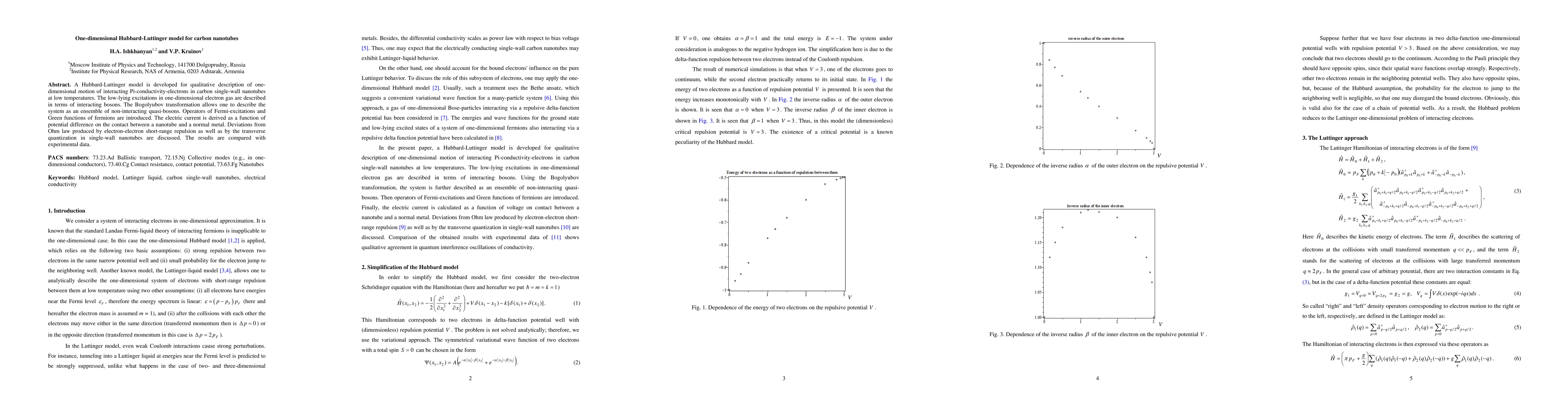 This paper develops a Hubbard-Luttinger model for carbon nanotubes to describe the one-dimensional motion of interacting pi-electrons at low temperatures, transforming the system into non-interacting quasi-bosons and deriving electric current as a function of potential difference. It discusses deviations from Ohm's law due to electron-electron repulsion and transverse quantization, comparing results with experimental data.
